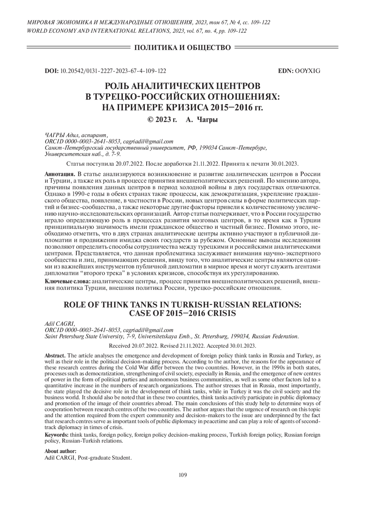 В статье анализируются возникновение и развитие аналитических центров в России и Турции, а также их роль в процессе принятия внешнеполитических решений. По мнению автора, причины появления данных центров в период холодной войны в двух государствах отличаются. Однако в 1990-е годы в обеих странах такие процессы, как демократизация, укрепление гражданского общества, появление, в частности в России, новых центров силы в форме политических партий и бизнес-сообщества, а также некоторые другие факторы привели к количественному увеличению научно-исследовательских организаций. Автор статьи подчеркивает, что в России государство играло определяющую роль в процессах развития мозговых центров, в то время как в Турции принципиальную значимость имели гражданское общество и частный бизнес. Помимо этого, необходимо отметить, что в двух странах аналитические центры активно участвуют в публичной дипломатии и продвижении имиджа своих государств за рубежом. Основные выводы исследования позволяют определить способы сотрудничества между турецкими и российскими аналитическими центрами. Представляется, что данная проблематика заслуживает внимания научно-экспертного сообщества и лиц, принимающих решения, ввиду того что аналитические центры являются одними из важнейших инструментов публичной дипломатии в мирное время и могут служить агентами дипломатии “второго трека” в условиях кризисов, способствуя их урегулированию.