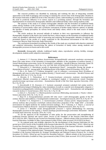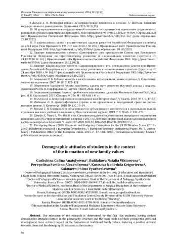 1. Антонов Г. В. Основные факторы формирования демографических установок населения современной России // Вестник Московского университета. Серия 18. Социология и политология. 2015. № 4. С. 169-182. DOI: 10.24290/1029-3736-2015-0-4-169-182 EDN: WBORGT