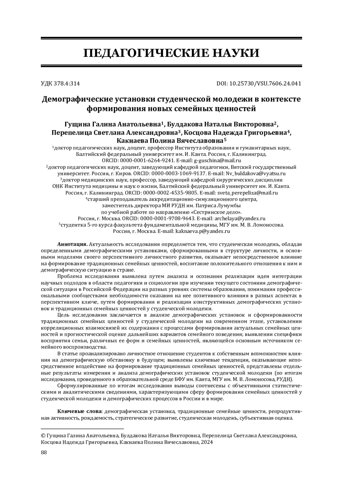 Актуальность исследования определяется тем, что студенческая молодежь, обладая определенными демографическими установками, сформированными в структуре личности, и основными моделями своего перспективного личностного развития, оказывает непосредственное влияние на формирование традиционных семейных ценностей, воспитание положительного отношения к ним и демографическую ситуацию в стране. Проблема исследования выявлена путем анализа и осознания реализации идеи интеграции научных подходов в области педагогики и социологии при изучении текущего состояния демографической ситуации в Российской Федерации на разных уровнях системы образования, понимания профессиональными сообществами необходимости оказания на нее позитивного влияния в разных аспектах в перспективном ключе, путем формирования и реализации конструктивных демографических установок и традиционных семейных ценностей у студенческой молодежи. Цель исследования заключается в анализе демографических установок и сформированности традиционных семейных ценностей у студенческой молодежи на современном этапе, установлении корреляционных взаимосвязей их содержания с процессами формирования актуальных семейных ценностей и прогностической оценке дальнейших вариантов семейного поведения; выявлении специфики восприятия семьи, различных ее форм и семейных ценностей, являющейся основным источником семейного воспроизводства. В статье проанализировано личностное отношение студентов к собственным возможностям влияния на демографическую обстановку в будущем; выявлены ключевые тенденции, оказывающие непосредственное воздействие на формирование традиционных семейных ценностей, представлены отдельные результаты измерения и анализа демографических установок студенческой молодежи (по итогам исследования, проведенного в образовательной среде БФУ им. Канта, МГУ им. М. В. Ломоносова, РУДН). Сформулированные по итогам исследования выводы соотнесены с объективными статистическими и аналитическими сведениями, характеризующими сферу формирования семейных ценностей у студенческой молодежи и демографических процессов в России и в мире.