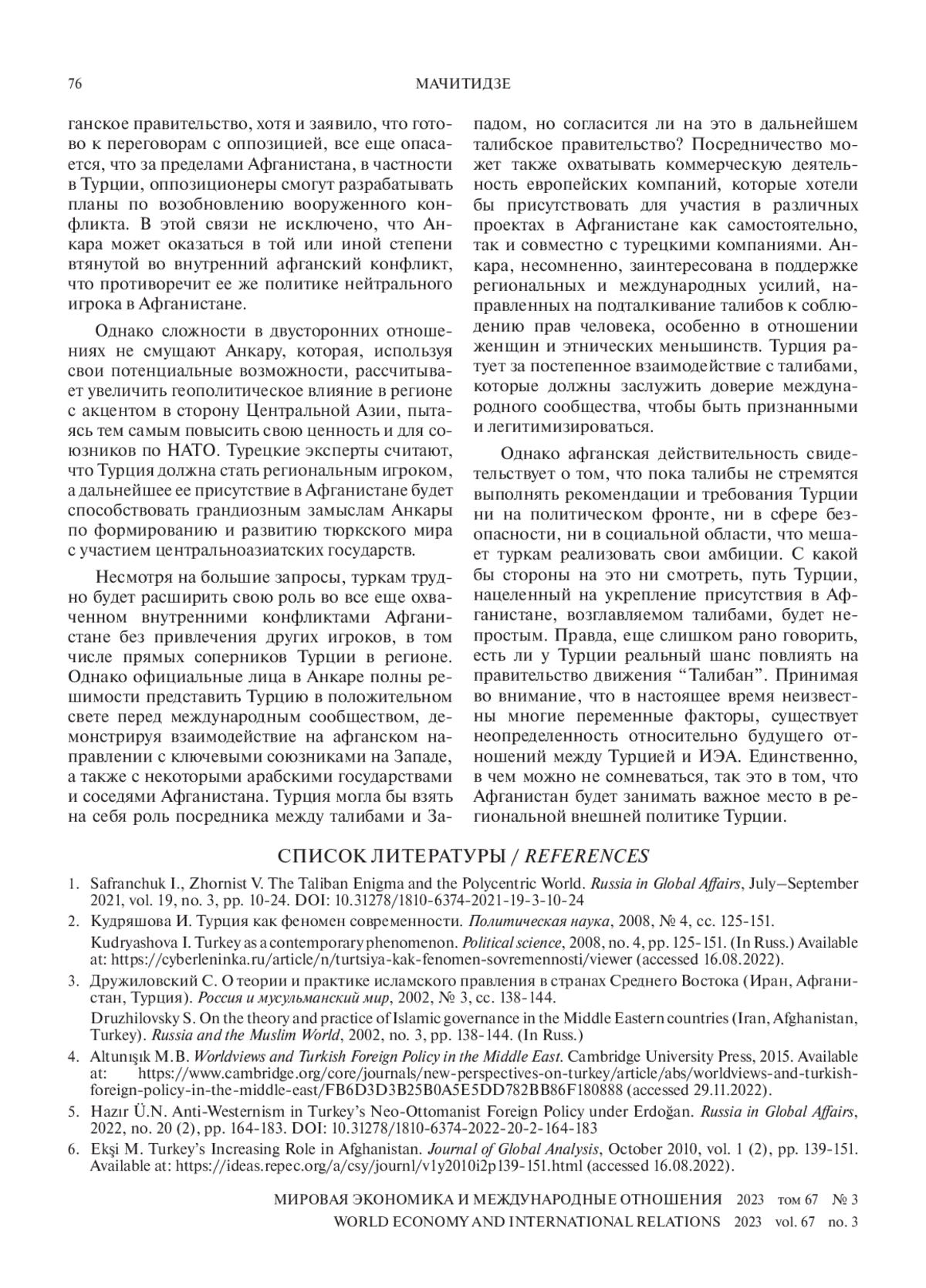 7. Giustino M. Risk or Opportunity? The new Afghan Islamic Emirate, Seen from Ankara. International Affairs, 06.09.2021. Available at: https://www.resetdoc.org/story/risk-opportunity-afghanistan-chaos-seen-from-ankara/ (accessed 16.12.2022).