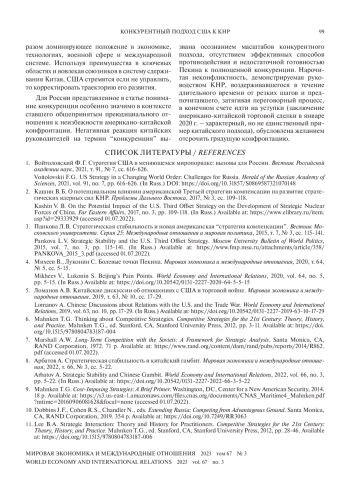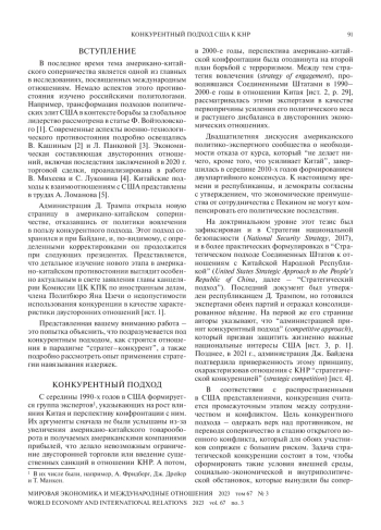 в последнее время тема американо-китайского соперничества является одной из главных в исследованиях, посвященных международным отношениям. Немало аспектов этого противостояния изучено российскими политологами. Например, трансформация подходов политических элит США в контексте борьбы за глобальное лидерство рассмотрена в статье Ф. войтоловского [1]. Современные аспекты военно-технологического противостояния подробно освещались в. Кашиным [2] и Л. Панковой [3]. Экономическая составляющая двусторонних отношений, включая последствия заключенной в 2020 г. торговой сделки, проанализирована в работе в. Михеева и С. Луконина [4]. Китайские подходы к взаимоотношениям с США представлены в трудах А. Ломанова [5].