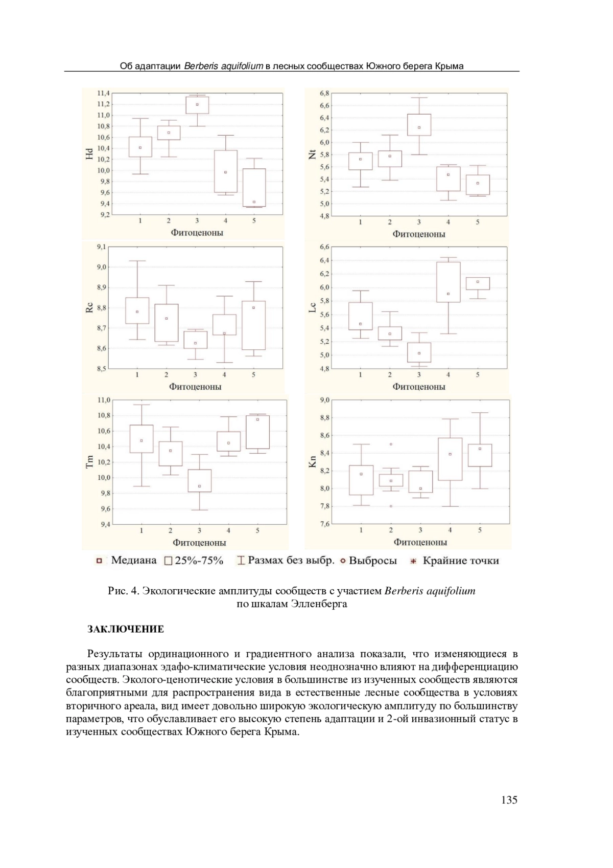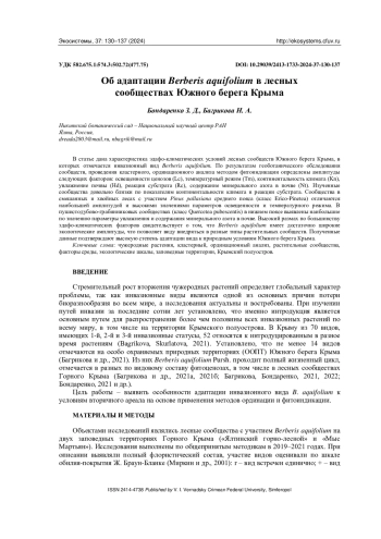В статье дана характеристика эдафо-климатических условий лесных сообществ Южного берега Крыма, в которых отмечается инвазионный вид Berberis aquifolium. По результатам геоботанического обследования сообществ, проведения кластерного, ординационного анализа методом фитоиндикации определены амплитуды следующих факторов: освещенности ценозов (Lc), температурный режим (Tm), континентальность климата (Kn), увлажнение почвы (Hd), реакция субстрата (Rc), содержание минерального азота в почве (Nt). Изученные сообщества довольно близки по показателям континентальности климата и реакции субстрата. Сообщества в смешанных и хвойных лесах с участием Pinus pallasiana среднего пояса (класс Erico-Pinetea) отличаются наибольшей амплитудой и высокими значениями параметров освещенности и температурного режима. В пушистодубово-грабинниковых сообществах (класс Quercetea pubescentis) в нижнем поясе выявлены наибольшие по значению параметры увлажнения и содержания минерального азота в почве. Высокий размах по большинству эдафо-климатических факторов свидетельствует о том, что Berberis aquifolium имеет достаточно широкие экологические амплитуды, что позволяет виду внедряться в разные типы растительных сообществ. Полученные данные подтверждают высокую степень адаптации вида к природным условиям Южного берега Крыма.