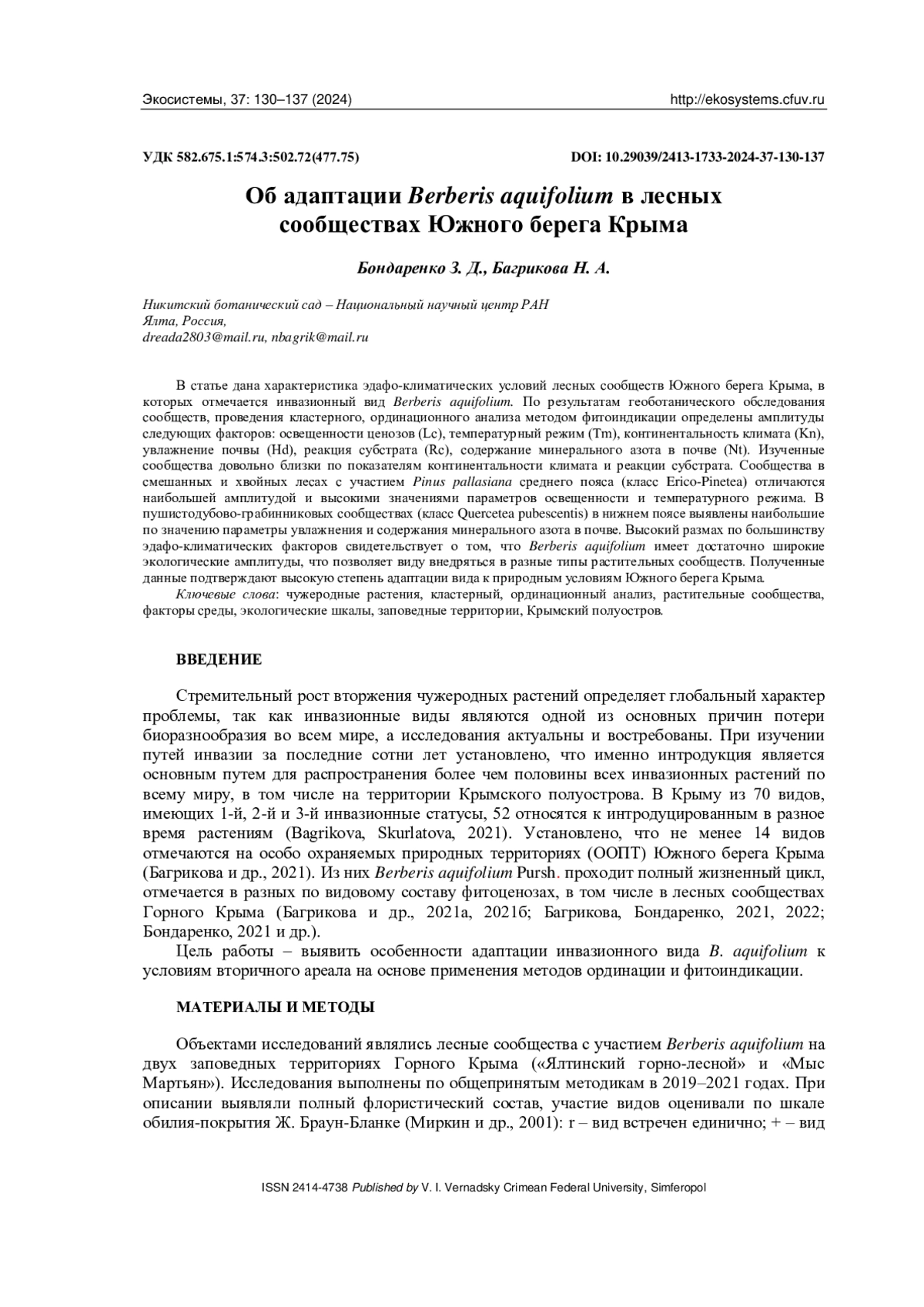 5. Бондаренко З. Д. Возрастная структура ценопопуляций Berberis aquifolium на особо охраняемых природных территориях Южного берега Крыма // Бюллетень Государственного Никитского ботанического сада. - 2021. - Вып. 141. - С. 24-35. EDN: TDEGTR