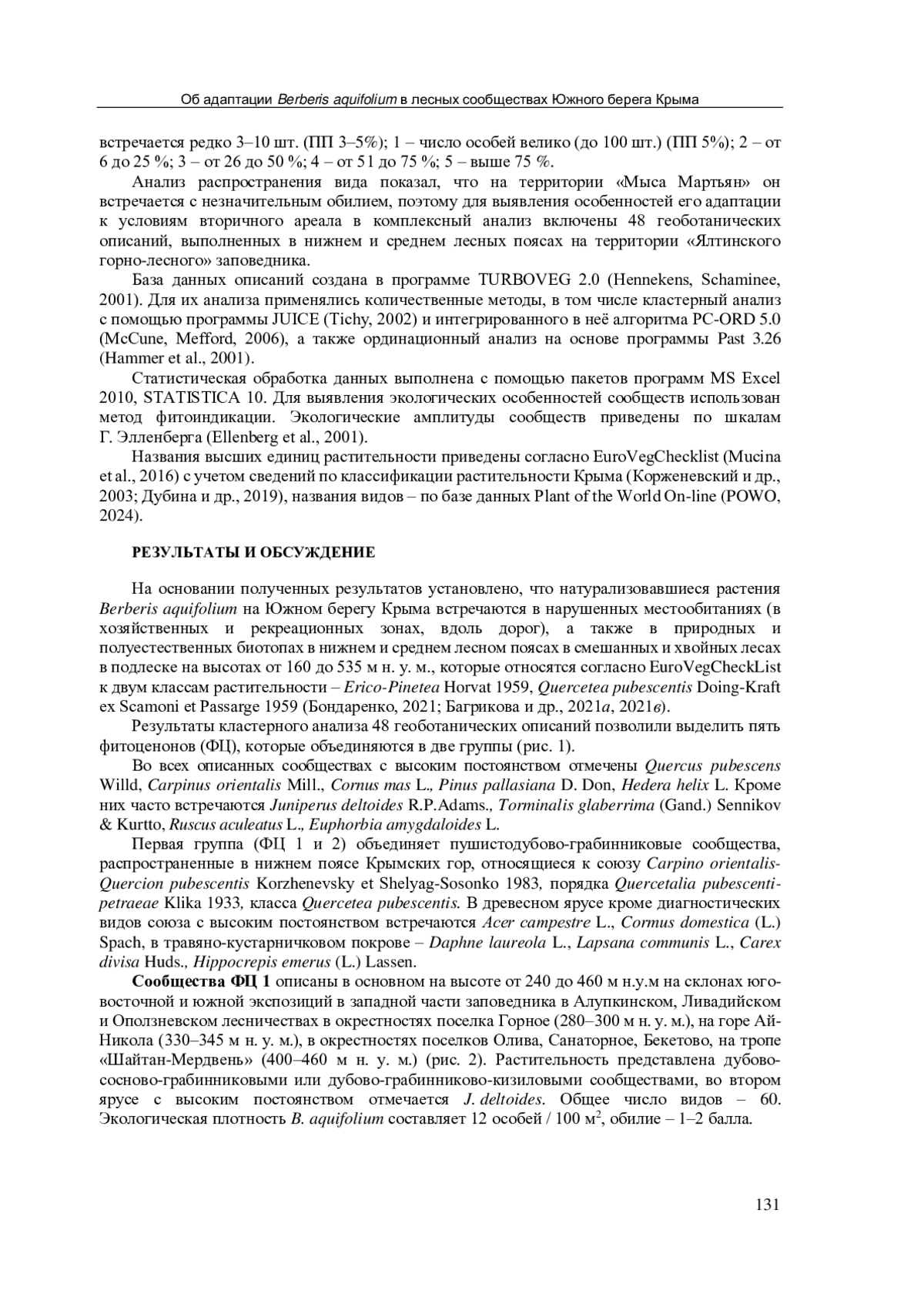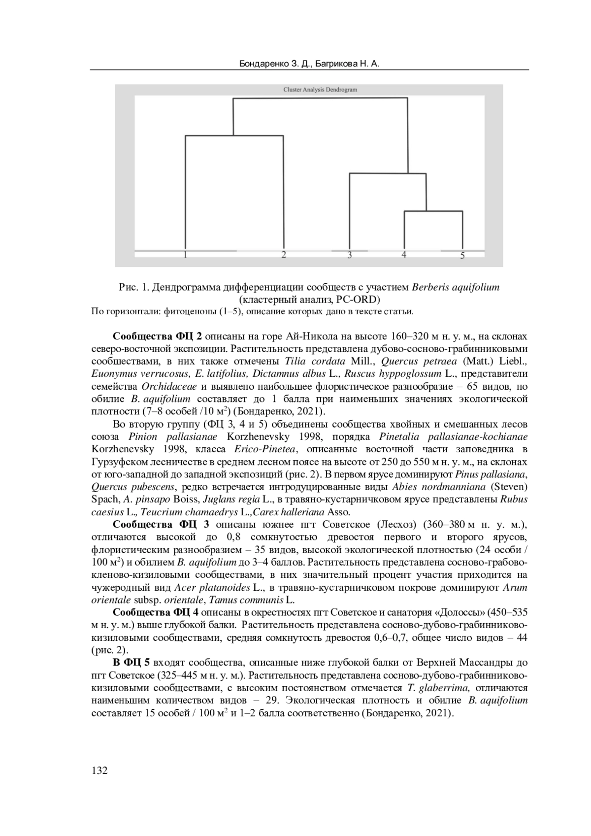 На основании полученных результатов установлено, что натурализовавшиеся растения Berberis aquifolium на Южном берегу Крыма встречаются в нарушенных местообитаниях (в хозяйственных и рекреационных зонах, вдоль дорог), а также в природных и полуестественных биотопах в нижнем и среднем лесном поясах в смешанных и хвойных лесах в подлеске на высотах от 160 до 535 м н. у. м., которые относятся согласно EuroVegCheckList к двум классам растительности – Erico-Pinetea Horvat 1959, Quercetea pubescentis Doing-Kraft ex Scamoni et Passarge 1959 (Бондаренко, 2021; Багрикова и др., 2021а, 2021в). Результаты кластерного анализа 48 геоботанических описаний позволили выделить пять фитоценонов (ФЦ), которые объединяются в две группы (рис. 1). Во всех описанных сообществах с высоким постоянством отмечены Quercus pubescens Willd, Carpinus orientalis Mill., Cornus mas L., Pinus pallasiana D. Don, Hedera helix L. Кроме них часто встречаются Juniperus deltoides R. P. Adams., Torminalis glaberrima (Gand.) Sennikov & Kurtto, Ruscus aculeatus L., Euphorbia amygdaloides L.