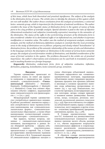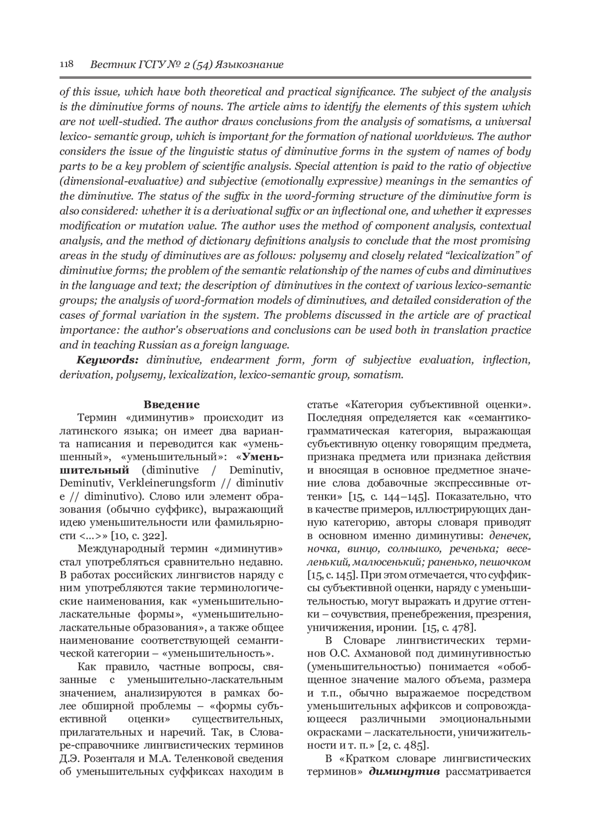 В статье на основе анализа дефиниций словарей лингвистических терминов и научных работ, посвященных категории «уменьшительности», определяются наиболее актуальные аспекты данной проблематики, имеющие не только теоретическое, но и практическое значение. Предмет анализа - уменьшительно-ласкательные формы имен существительных. Цель статьи - выявление недостаточно изученных участков этой системы. Основные выводы автора базируются на анализе соматизмов - универсальной лексико-семантической группы, имеющей важное значение для формирования национальных картин мира. В качестве ключевой проблемы научного анализа уменьшительно-ласкательных форм в системе наименований частей тела автор рассматривает вопрос об их языковом статусе. Особое внимание уделяется соотношению объективного (размерно-оценочного) и субъективного (эмоционально-экспрессивного) значений в семантике диминутива. Рассматривается также статус суффикса в словообразовательной структуре уменьшительно-ласкательной формы: является ли он словообразующим или формообразующим, модификационное или мутационное значение выражает. Используя метод компонентного анализа, контекстуальный анализ, метод анализа словарных дефиниций, автор статьи приходит к выводу, что наиболее перспективными направлениями в исследовании диминутивов являются: многозначность и тесно с ней связанная «лекцикализация» уменьшительно-ласкательных форм; проблема семантического соотношения наименований детенышей и диминутивов в языке и в тексте; описание диминутивов в рамках различных лексико-семантических групп; анализ словообразовательных моделей диминутивов и детальное рассмотрение случаев формального варьирования в этой системе. Проблемы, рассмотренные в статье, имеют практическое значение: наблюдения и выводы автора могут быть использованы как в практике перевода, так и в практике преподавания русского языка как иностранного.
