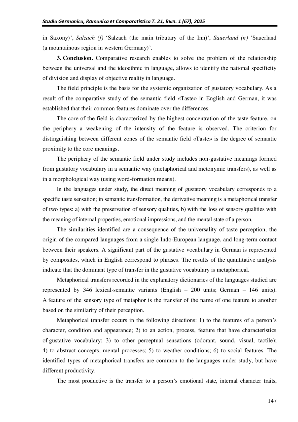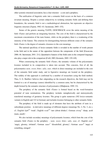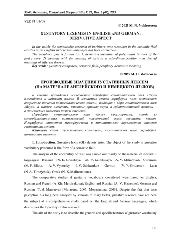 The periphery zone is formed by: 1) derivative meanings of polysemuos lexemes of the field’s core; 2) elements with the meaning of taste in a subordinate position – in derived meanings of different degrees.