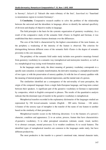 В статье проводится исследование периферии семантического поля «Вкус» в английском и немецком языках. В изучаемых языках периферию поля составляют вторичные значения полисемантических лексем, входящих в ядро семантического поля «Вкус», а также элементы, имеющие признак вкуса в субординативной позиции – в производных значениях разных степеней.
