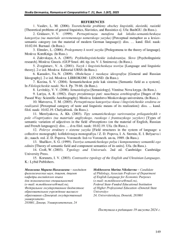 7. Kezina, S. V. (2004). Semanticheskoe pole kak sistema [Semantic field as a system]. In Filologicheskie nauki. No 4. Pp. 79-86. (In Russ.).