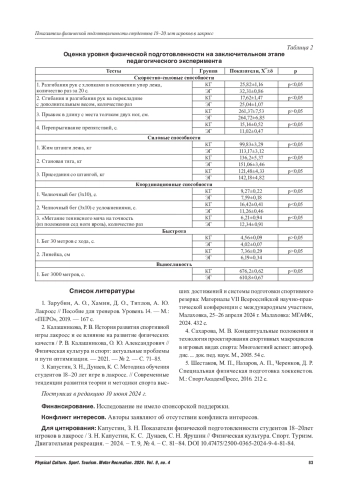 В статье рассматривается изменение показателей уровня развития физических качеств у студентов 18-20 лет в лакроссе после проведения педагогического эксперимента. Исследование длилось в течение полугода и состояло из шести мезоциклов. До начала эксперимента и после его окончания было проведено тестирование по определению динамики показателей контрольных упражнений, характеризующих некоторые показатели уровня развития двигательных качеств.