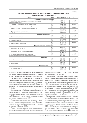 В статье представлены результаты тестирования общей и специальной физической подготовленности у десяти юношей 19,3±0,6 лет, входящих в сборную команду Сирии по шоссейным гонкам в начале и в конце подготовительного периода. Получена динамика исследуемых показателей за период исследования десятинедельного тренировочного цикла: среднегрупповые показатели быстроты увеличились на 4,9 %, среднегрупповые показатели взрывной силы (силовой компонент) увеличились на 4,8 %, среднегрупповые показателя взрывной силы (скоростной компонент) выросли на 4,4 %, среднегрупповые показатели специальной выносливости увеличились на 5,4 %, показатели обшей выносливость увеличились на 6,2 %. И в конце педагогического исследования результаты нормативов всех спортсменов соответствовали нормативу выше нормы и норме, что свидетельствует об эффективности используемой методики подготовки.