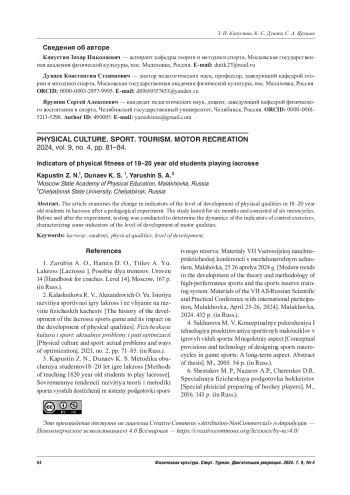 3. Капустин, З. Н., Дунаев, К. С. Методика обучения студентов 18-20 лет игре в лакросс. // Современные тенденции развития теории и методики спорта высших достижений и системы подготовки спортивного резерва: Материалы VII Всероссийской научно-практической конференции с международным участием, Малаховка, 25-26 апреля 2024 г. Малаховка: МГАФК, 2024. 432 с. EDN: GVOZKG