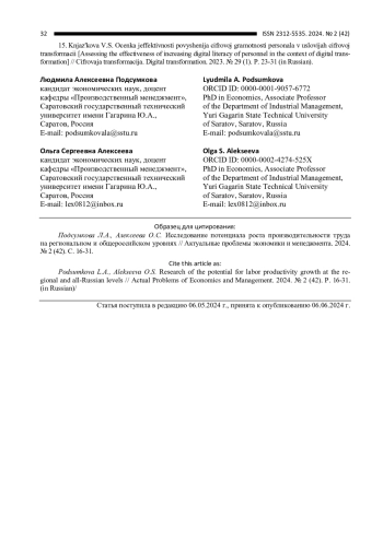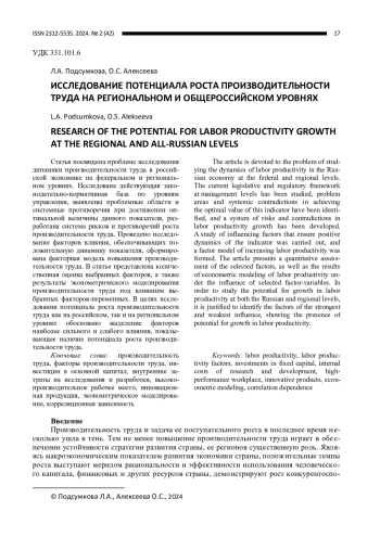 В целях исследования потенциала роста производительности труда как на российском, так и на региональном уровнях обосновано выделение факторов наиболее сильного и слабого влияния, показывающее наличие потенциала роста производительности труда.