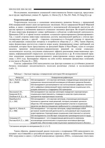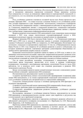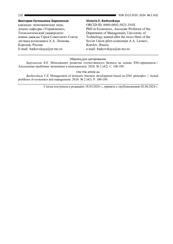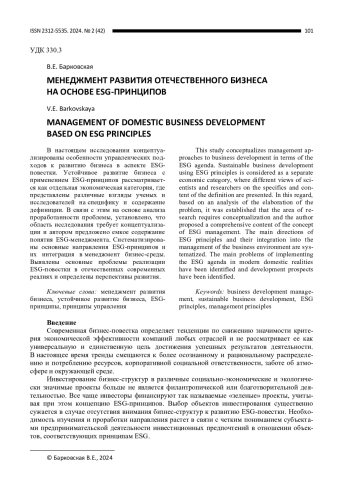 В настоящем исследовании концептуализированы особенности управленческих подходов к развитию бизнеса в аспекте ESGповестки. Устойчивое развитие бизнеса с применением ESGпринципов рассматривается как отдельная экономическая категория, где представлены различные взгляды ученых и исследователей на специфику и содержание дефиниции. В связи с этим на основе анализа проработанности проблемы, установлено, что область исследования требует концептуализации и автором предложено емкое содержание понятия ESGменеджмента. Систематизированы основные направления ESGпринципов и их интеграция в менеджмент бизнессреды. Выявлены основные проблемы реализации ESGповестки в отечественных современных реалиях и определены перспективы развития.