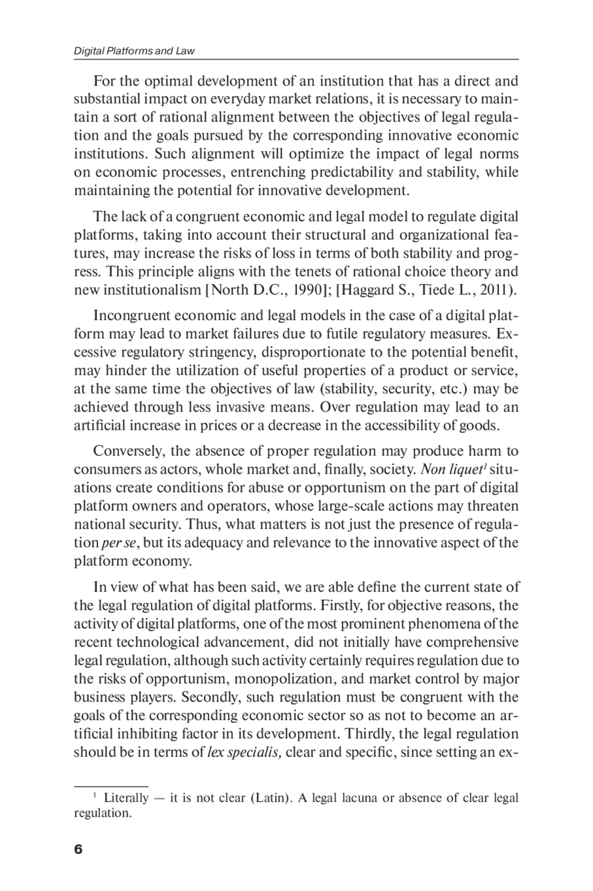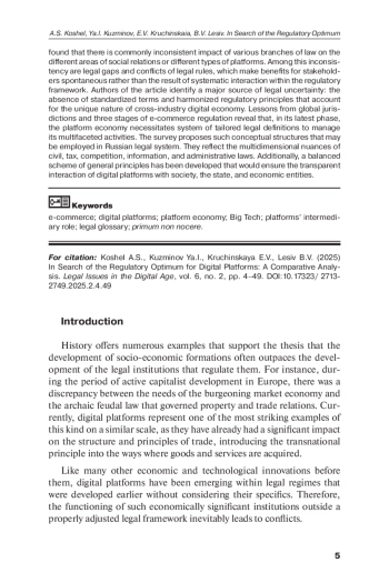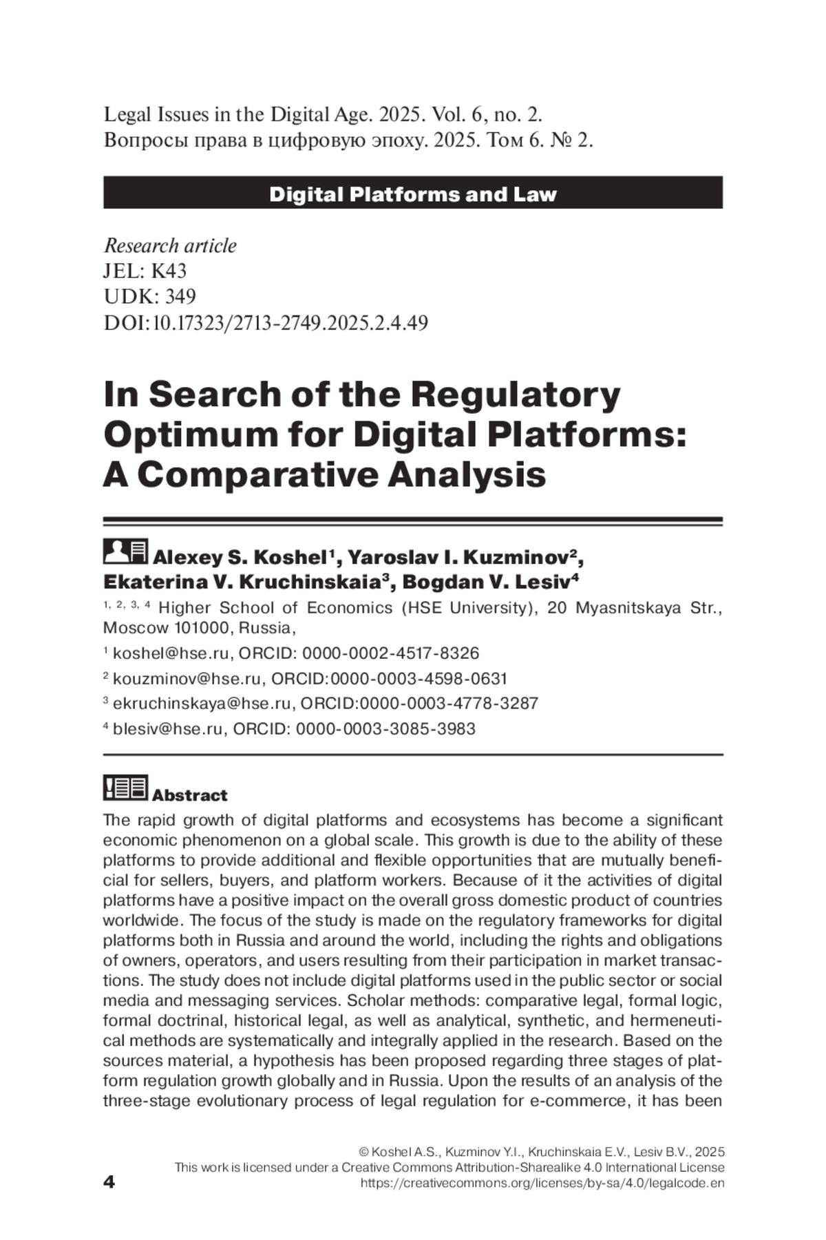 The rapid growth of digital platforms and ecosystems has become a significant economic phenomenon on a global scale. This growth is due to the ability of these platforms to provide additional and flexible opportunities that are mutually beneficial for sellers, buyers, and platform workers. Because of it the activities of digital platforms have a positive impact on the overall gross domestic product of countries worldwide. The focus of the study is made on the regulatory frameworks for digital platforms both in Russia and around the world, including the rights and obligations of owners, operators, and users resulting from their participation in market transactions. The study does not include digital platforms used in the public sector or social media and messaging services. Scholar methods: comparative legal, formal logic, formal doctrinal, historical legal, as well as analytical, synthetic, and hermeneutical methods are systematically and integrally applied in the research. Based on the sources material, a hypothesis has been proposed regarding three stages of platform regulation growth globally and in Russia. Upon the results of an analysis of the three-stage evolutionary process of legal regulation for e-commerce, it has been found that there is commonly inconsistent impact of various branches of law on the different areas of social relations or different types of platforms. Among this inconsistency are legal gaps and conflicts of legal rules, which make benefits for stakeholders spontaneous rather than the result of systematic interaction within the regulatory framework. Authors of the article identify a major source of legal uncertainty: the absence of standardized terms and harmonized regulatory principles that account for the unique nature of cross-industry digital economy. Lessons from global jurisdictions and three stages of e-commerce regulation reveal that, in its latest phase, the platform economy necessitates system of tailored legal definitions to manage its multifaceted activities. The survey proposes such conceptual structures that may be employed in Russian legal system. They reflect the multidimensional nuances of civil, tax, competition, information, and administrative laws. Additionally, a balanced scheme of general principles has been developed that would ensure the transparent interaction of digital platforms with society, the state, and economic entities.