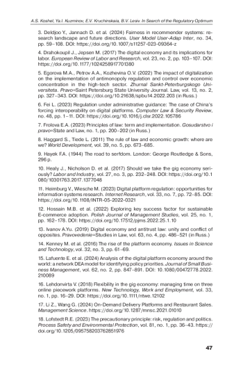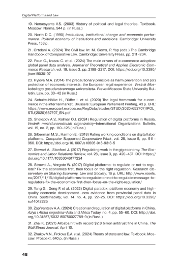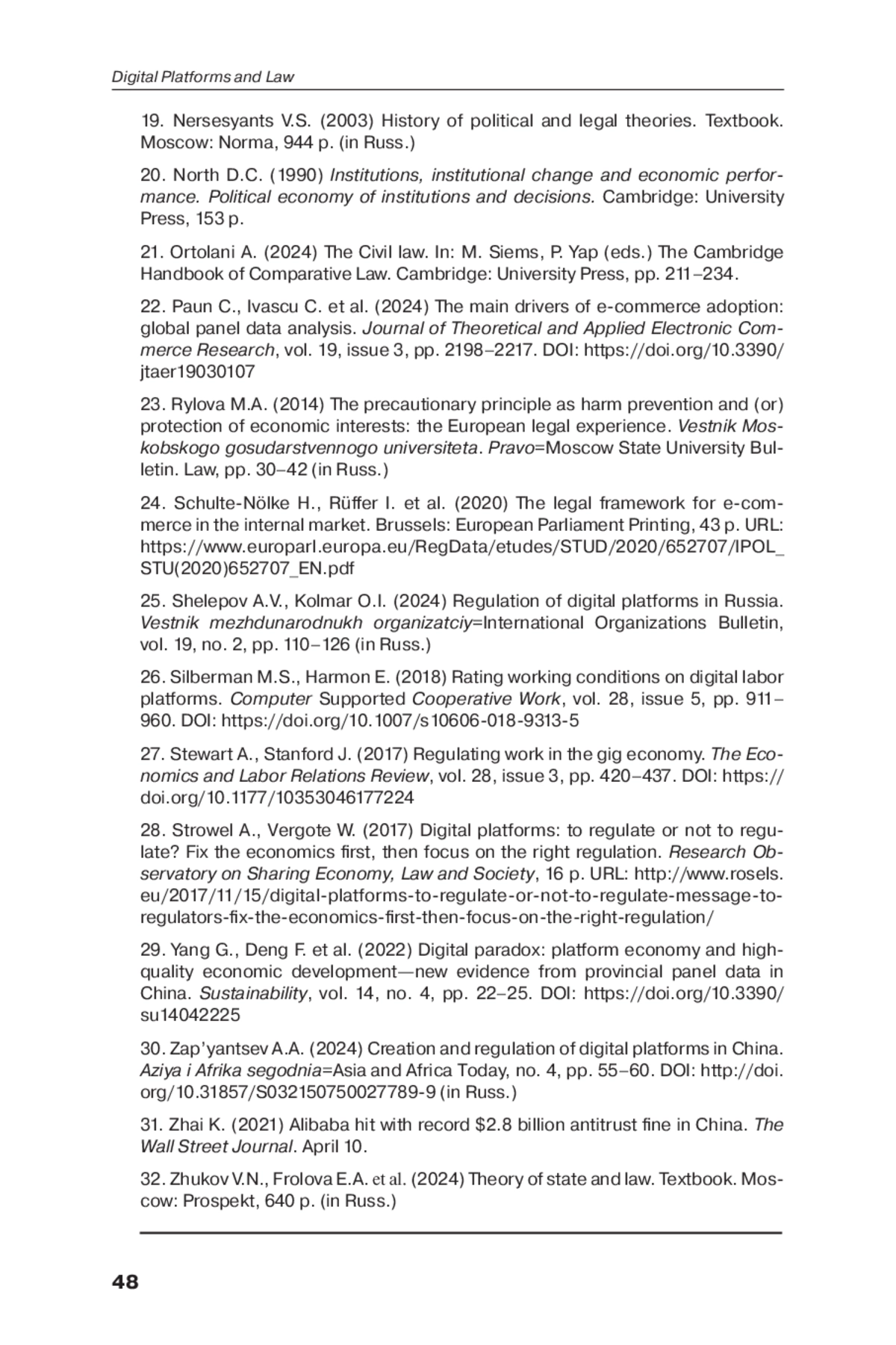 25. Shelepov A.V., Kolmar O.I. (2024) Regulation of digital platforms in Russia. Vestnik mezhdunarodnukh organizatciy=International Organizations Bulletin, vol. 19, no. 2, pp. 110-126 (in Russ.).