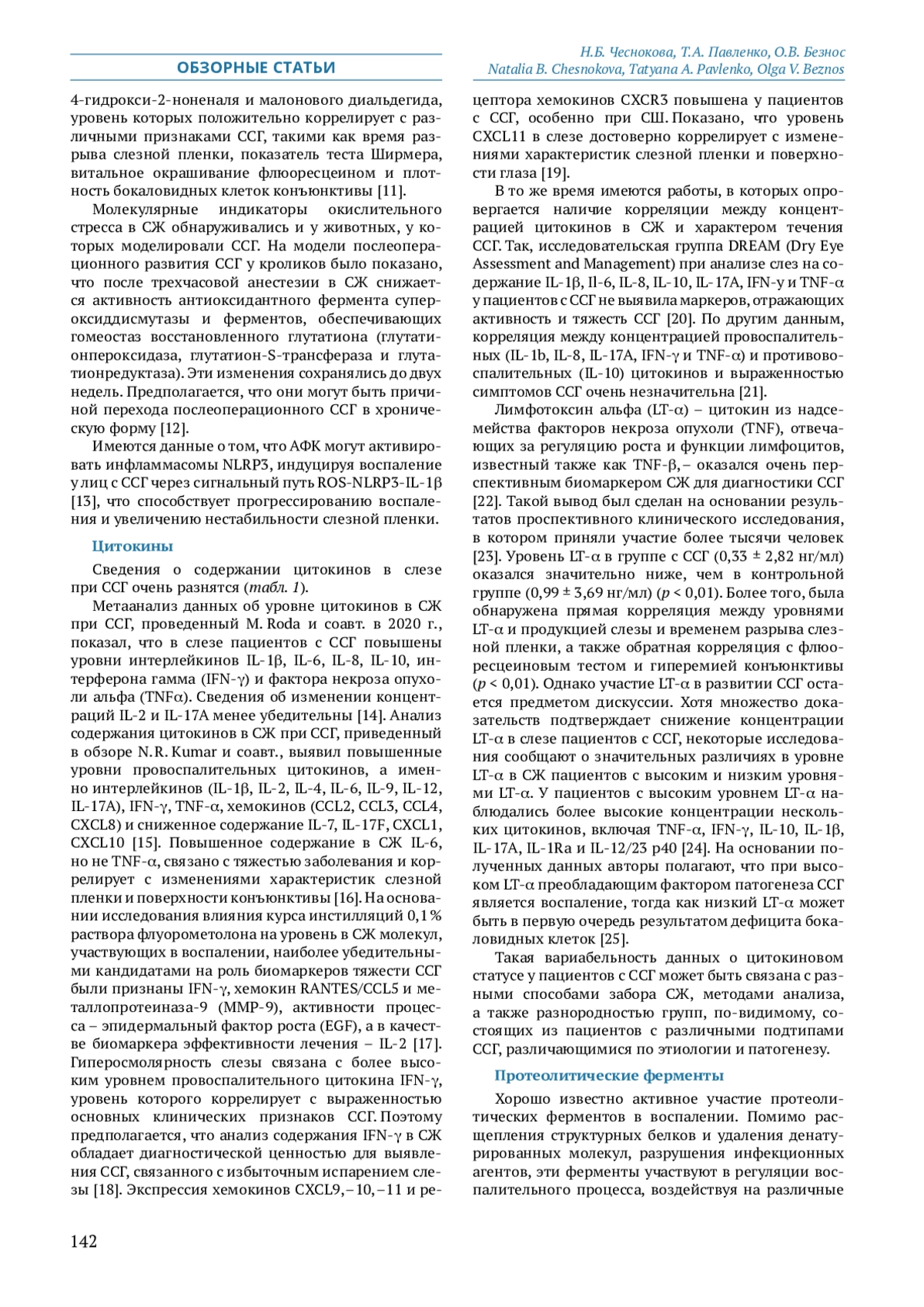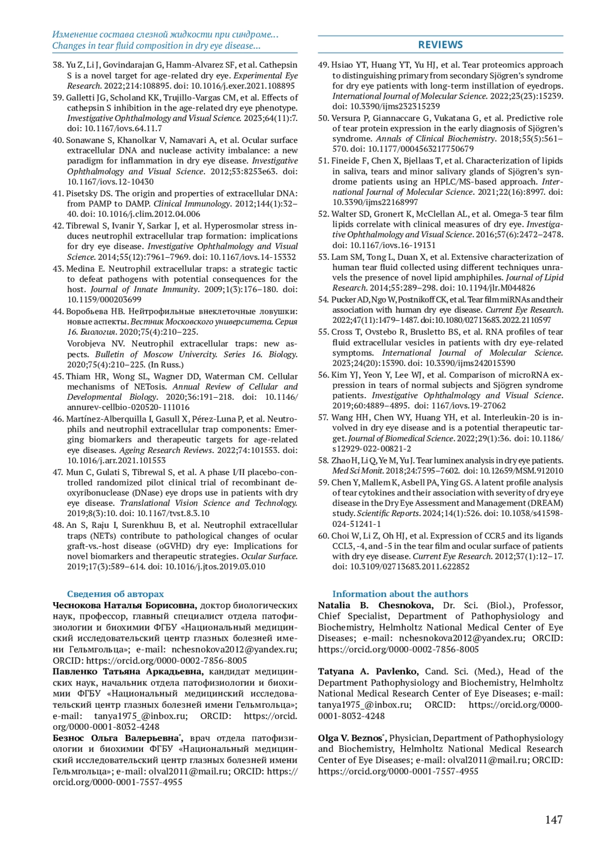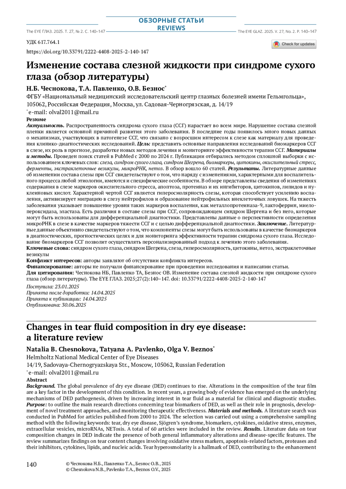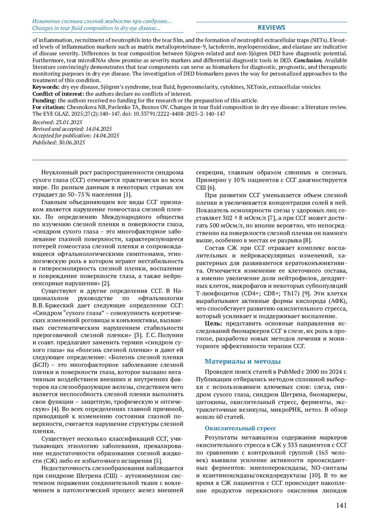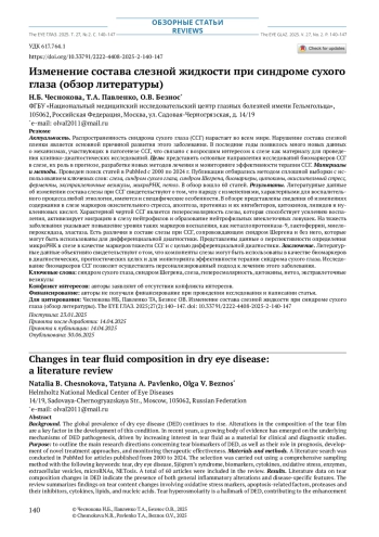 Распространенность синдрома сухого глаза (ССГ) нарастает во всем мире. Нарушение состава слезной пленки является основной причиной развития этого заболевания. В последние годы появилось много новых данных о механизмах, участвующих в патогенезе ССГ, что связано с возросшим интересом к слезе как материалу для проведения клинико-диагностических исследований. Цель: представить основные направления исследований биомаркеров ССГ в слезе, их роль в прогнозе, разработке новых методов лечения и мониторинге эффективности терапии ССГ. Материалы и методы. Проведен поиск статей в PubMed с 2000 по 2024 г. Публикации отбирались методом сплошной выборки с использованием ключевых слов: слеза, синдром сухого глаза, синдром Шегрена, биомаркеры, цитокины, окислительный стресс, ферменты, экстраклеточные везикулы, микроРНК, нетоз. В обзор вошло 60 статей. Результаты. Литературные данные об изменении состава слезы при ССГ свидетельствуют о том, что наряду с изменениями, характерными для воспалительного процесса любой этиологии, имеются и специфические особенности. В обзоре представлены сведения об изменениях содержания в слезе маркеров окислительного стресса, апоптоза, протеиназ и их ингибиторов, цитокинов, липидов и нуклеиновых кислот. Характерной чертой ССГ является гиперосмолярность слезы, которая способствует усилению воспаления, активизирует миграцию в слезу нейтрофилов и образование нейтрофильных внеклеточных ловушек. На тяжесть заболевания указывает повышение уровня таких маркеров воспаления, как металлопротеиназа‑9, лактоферрин, миелопероксидаза, эластаза. Есть различия в составе слезы при ССГ, сопровождающем синдром Шергена и без него, которые могут быть использованы для дифференциальной диагностики. Представлены данные о перспективности определения микроРНК в слезе в качестве маркеров тяжести ССГ и с целью дифференциальной диагностики. Заключение. Литературные данные объективно свидетельствуют о том, что компоненты слезы могут быть использованы в качестве биомаркеров в диагностических, прогностических целях и для мониторинга эффективности терапии синдрома сухого глаза. Исследование биомаркеров ССГ позволит осуществлять персонализированный подход к лечению этого заболевания.