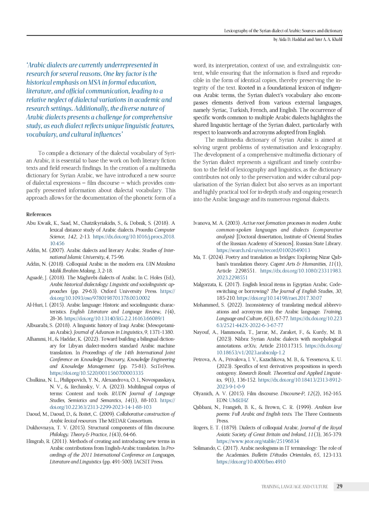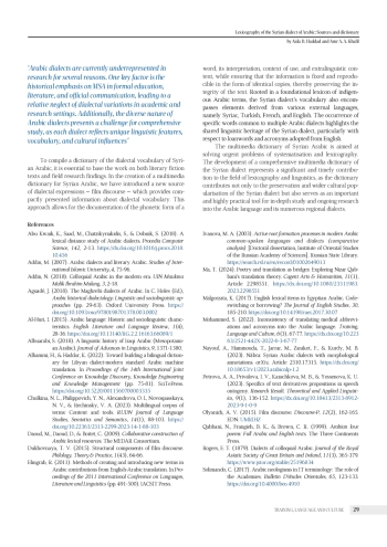 1. Abu Kwaik, K., Saad, M., Chatzikyriakidis, S., & Dobnik, S. (2018). A lexical distance study of Arabic dialects. Procedia Computer Science, 142, 2-13. DOI: 10.1016/j.procs.2018.10.456