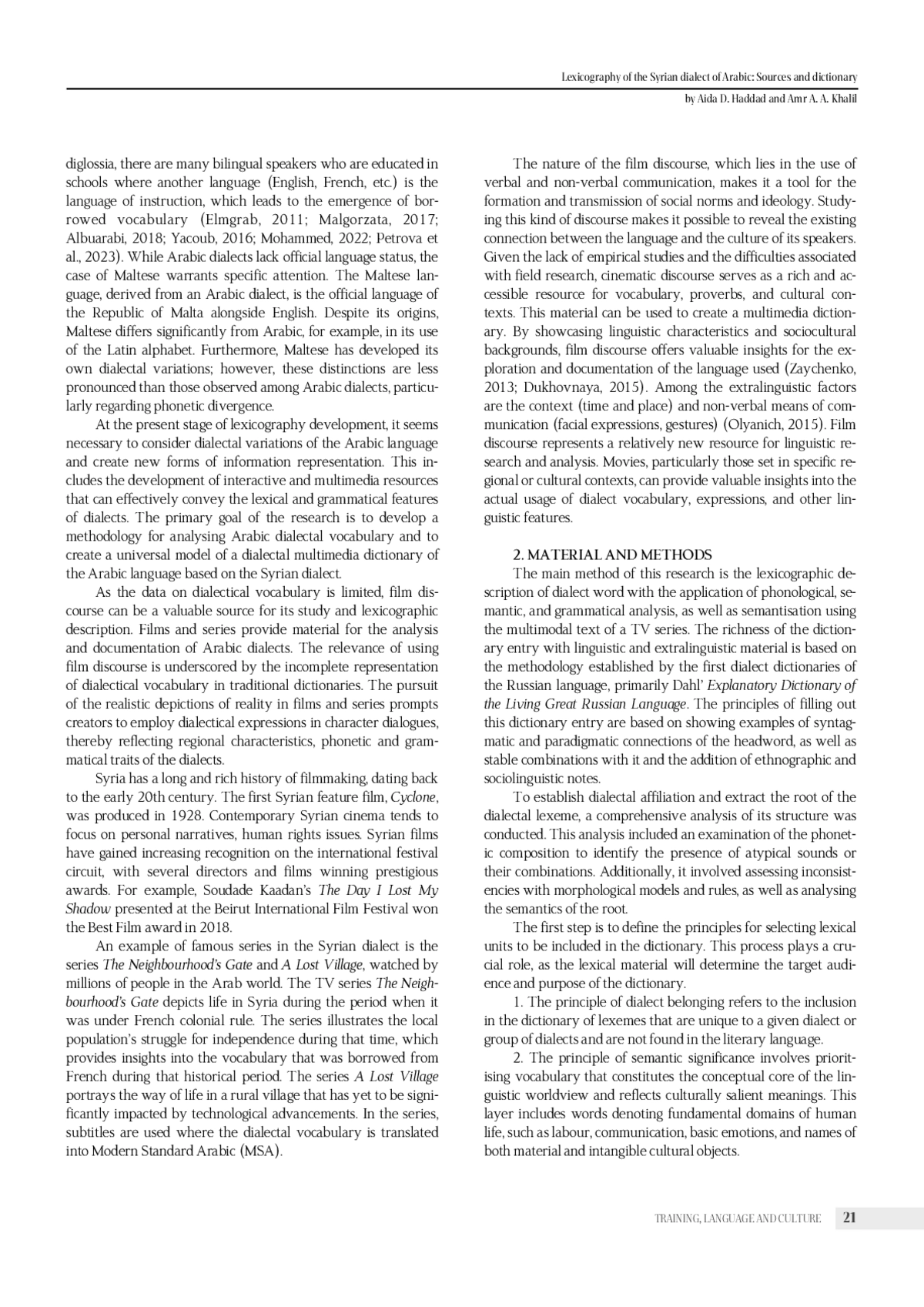 The linguistic phenomenon of the Arabic language, which exists in a variety of dialectal forms alongside the general literary form, necessitates the search for new lexicographic solutions (Daoud et al., 2009). This paper examines the film discourse of the Syrian TV series as a source of dialect vocabulary, aiming to create a new type of dictionary.