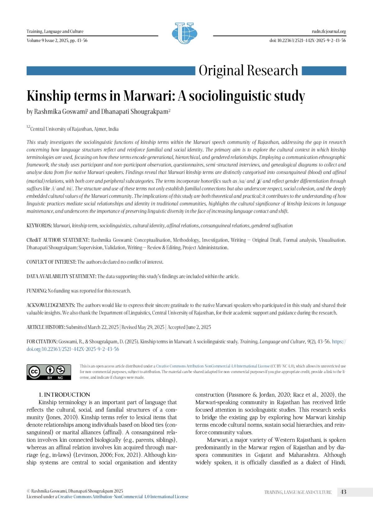 Kinship terminology is an important part of language that reflects the cultural, social, and familial structures of a community (Jones, 2010). Kinship terms refer to lexical items that denote relationships among individuals based on blood ties (consanguineal) or marital alliances (affinal). A consanguineal relation involves kin connected biologically (e. g., parents, siblings), whereas an affinal relation involves kin acquired through marriage (e. g., in-laws) (Levinson, 2006; Fox, 2021). Although kinship systems are central to social organisation and identity construction (Passmore & Jordan, 2020; Racz et al., 2020), the Marwari-speaking community in Rajasthan has received little focused attention in sociolinguistic studies. This research seeks to bridge the existing gap by exploring how Marwari kinship terms encode cultural norms, sustain social hierarchies, and reinforce community values.