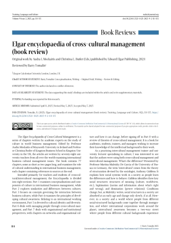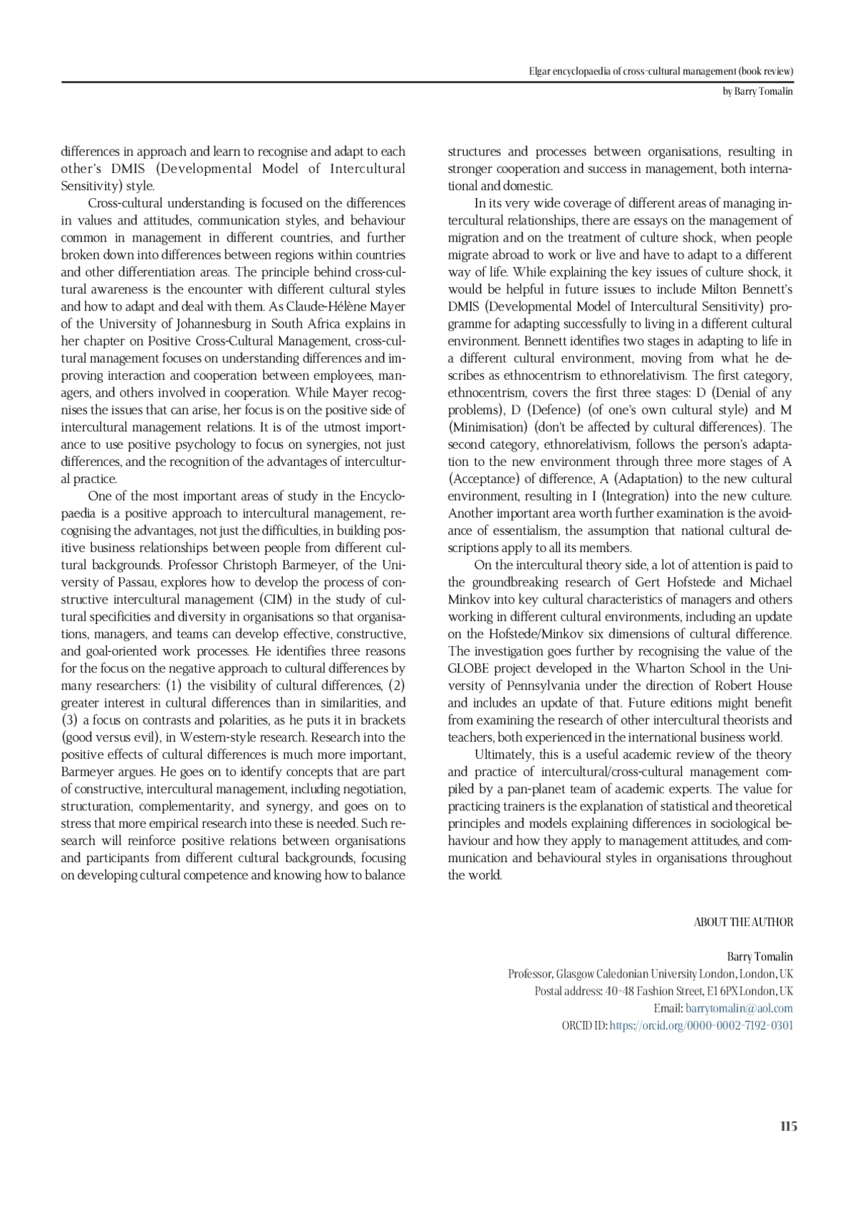 The Elgar Encyclopaedia of Cross-Cultural Management is a series of chapters written by academic experts on the study of culture in world business management. Edited by Professor Audra Mockaitis of Maynooth University in Ireland and Professor Christina Butler of Kingston Business School in Kingston University in the UK, the articles are written by seventy-eight university teachers from all over the world examining international business cultural management issues. The book contains 77 chapters, some as short as two pages long, and examines the role of cultural understanding in international business management, each chapter containing references to sources at the end.