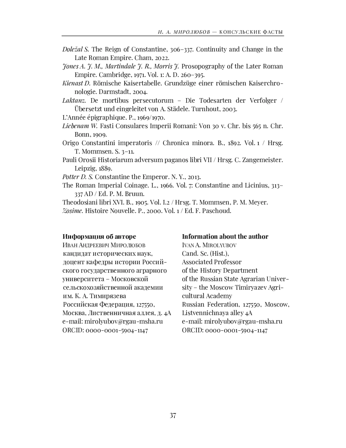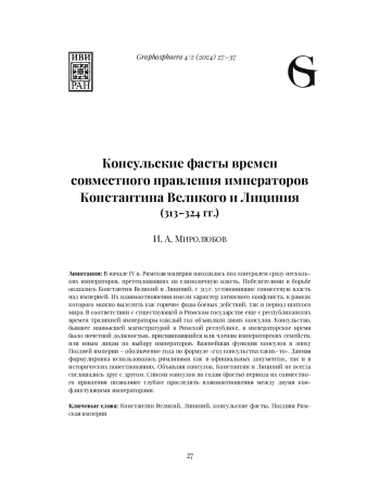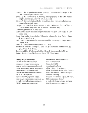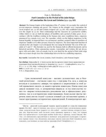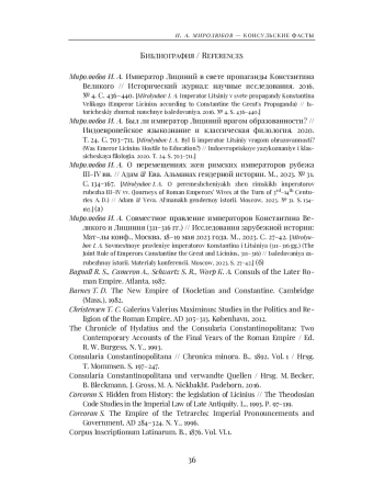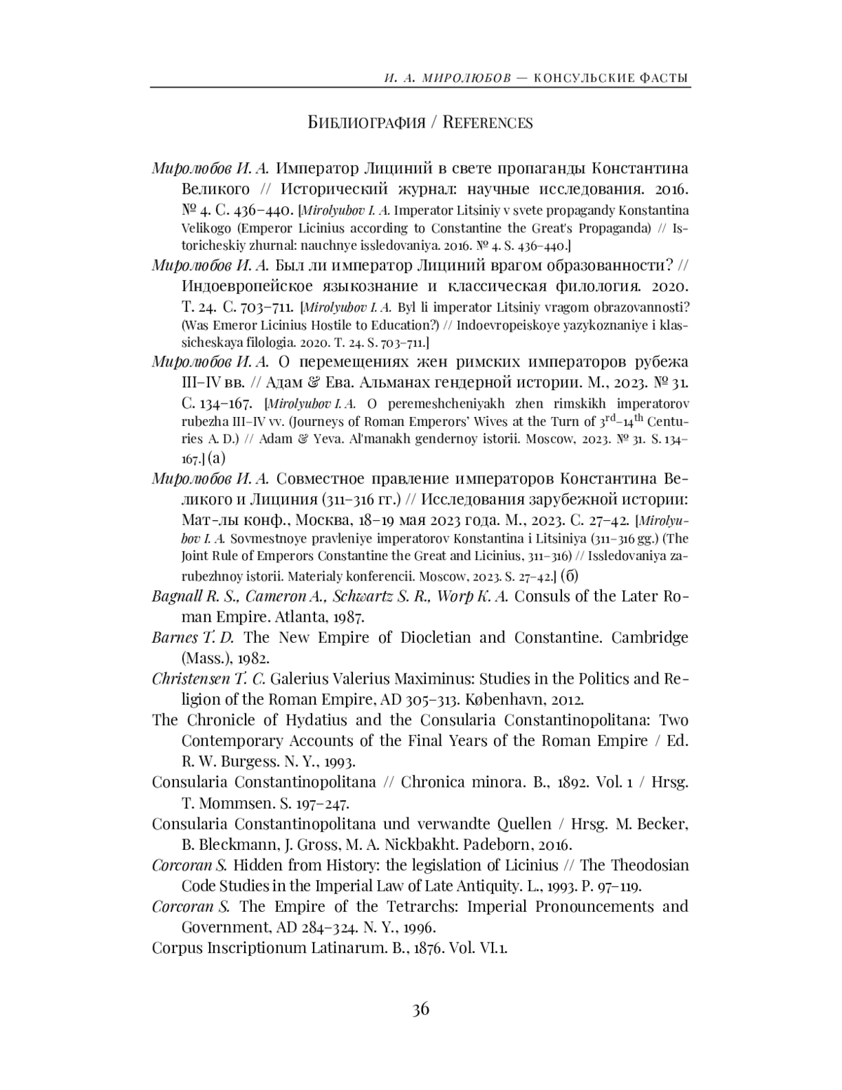 Mirolyubov I. A. Sovmestnoye pravleniye imperatorov Konstantina i Litsiniya (311-316 gg.) (The Joint Rule of Emperors Constantine the Great and Licinius, 311-316) // Issledovaniya zarubezhnoy istorii. Materialy konferencii. Moscow, 2023. S. 27-42. (б).