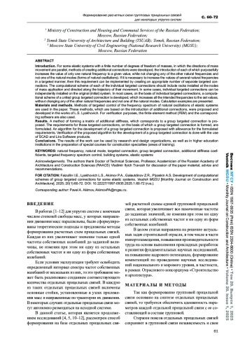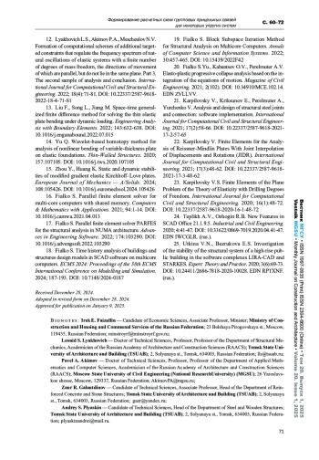 11. Lyakhovich L.S., Akimov P.A. Formation of Computational Schemes of Additional Targeted Constraints That Regulate the Frequency Spectrum of Natural Oscillations of Elastic Systems with a Finite Number of Degrees of Mass Freedom, the Directions of Movement of Which are Parallel, But Do Not Lie in the Same Plane. Part 2: The First Sample of Analysis // International Journal for Computational Civil and Structural Engineering. 2022. Vol. 18. Issue 3. Pp. 137-146. DOI: 10.22337/2587-9618-2022-18-3-137-146 EDN: NEQMFT