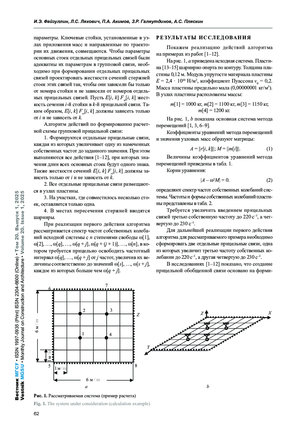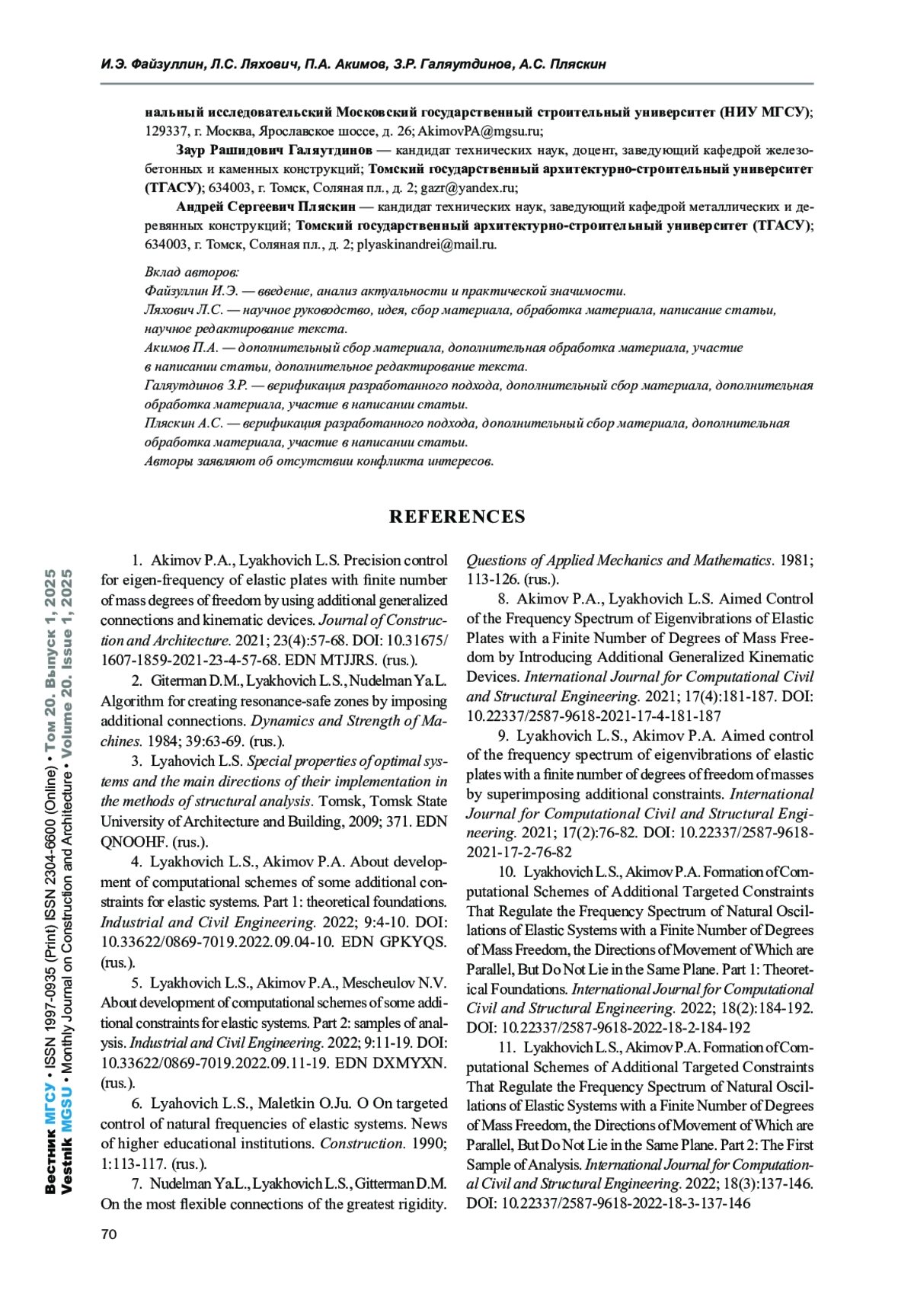 8. Akimov P.A., Lyakhovich L.S. Aimed Control of the Frequency Spectrum of Eigenvibrations of Elastic Plates with a Finite Number of Degrees of Mass Freedom by Introducing Additional Generalized Kinematic Devices // International Journal for Computational Civil and Structural Engineering. 2021. Vol. 17. Issue 4. Pp. 181-187. DOI: 10.22337/2587-9618-2021-17-4-181-187 EDN: RAAAYR