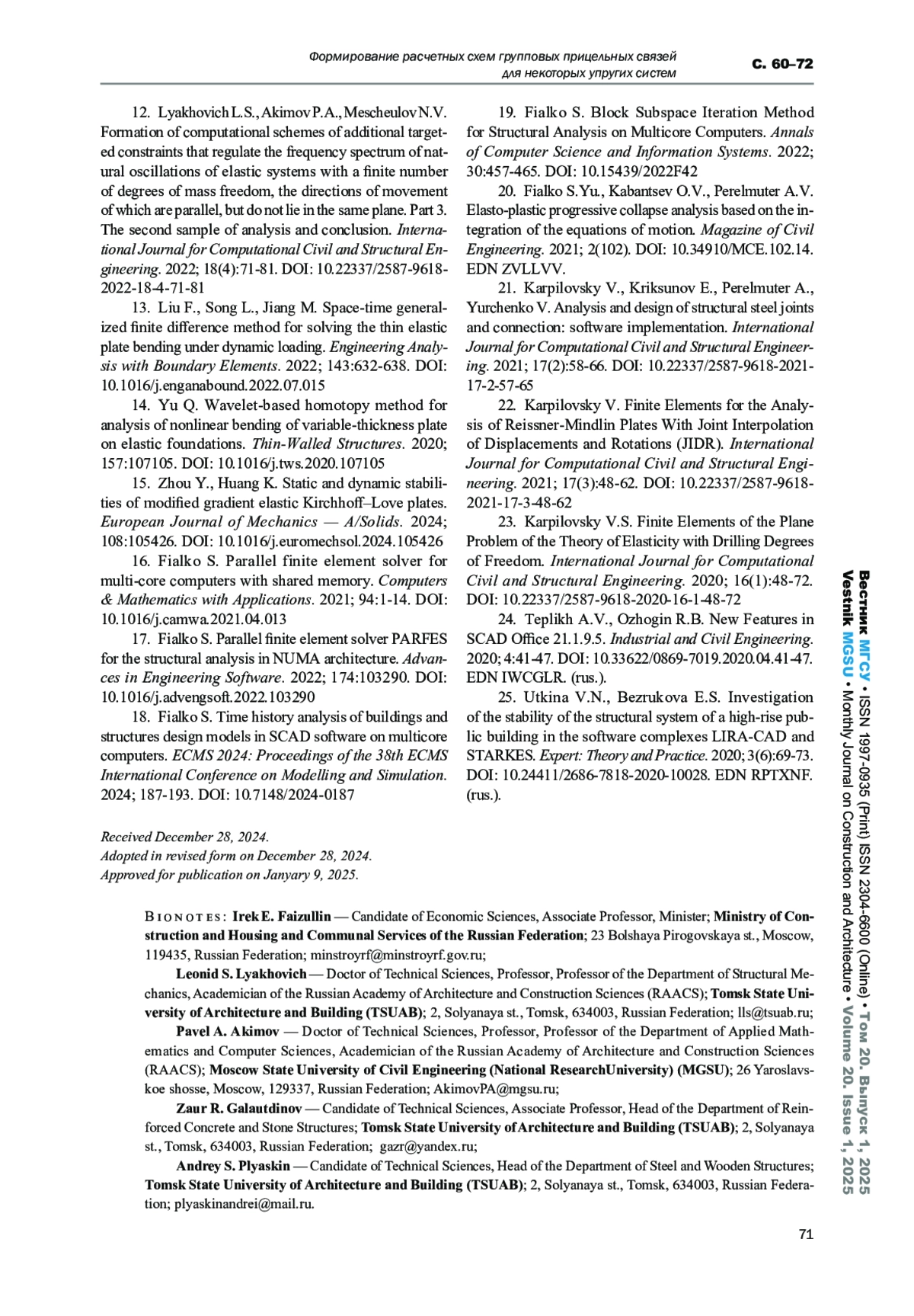 12. Lyakhovich L.S., Akimov P.A., Mescheulov N.V. Formation of computational schemes of additional targeted constraints that regulate the frequency spectrum of natural oscillations of elastic systems with a finite number of degrees of mass freedom, the directions of movement of which are parallel, but do not lie in the same plane. Part 3. The second sample of analysis and conclusion // International Journal for Computational Civil and Structural Engineering. 2022. Vol. 18. Issue 4. Pp. 71-81. DOI: 10.22337/2587-9618-2022-18-4-71-81 EDN: PPCRFU