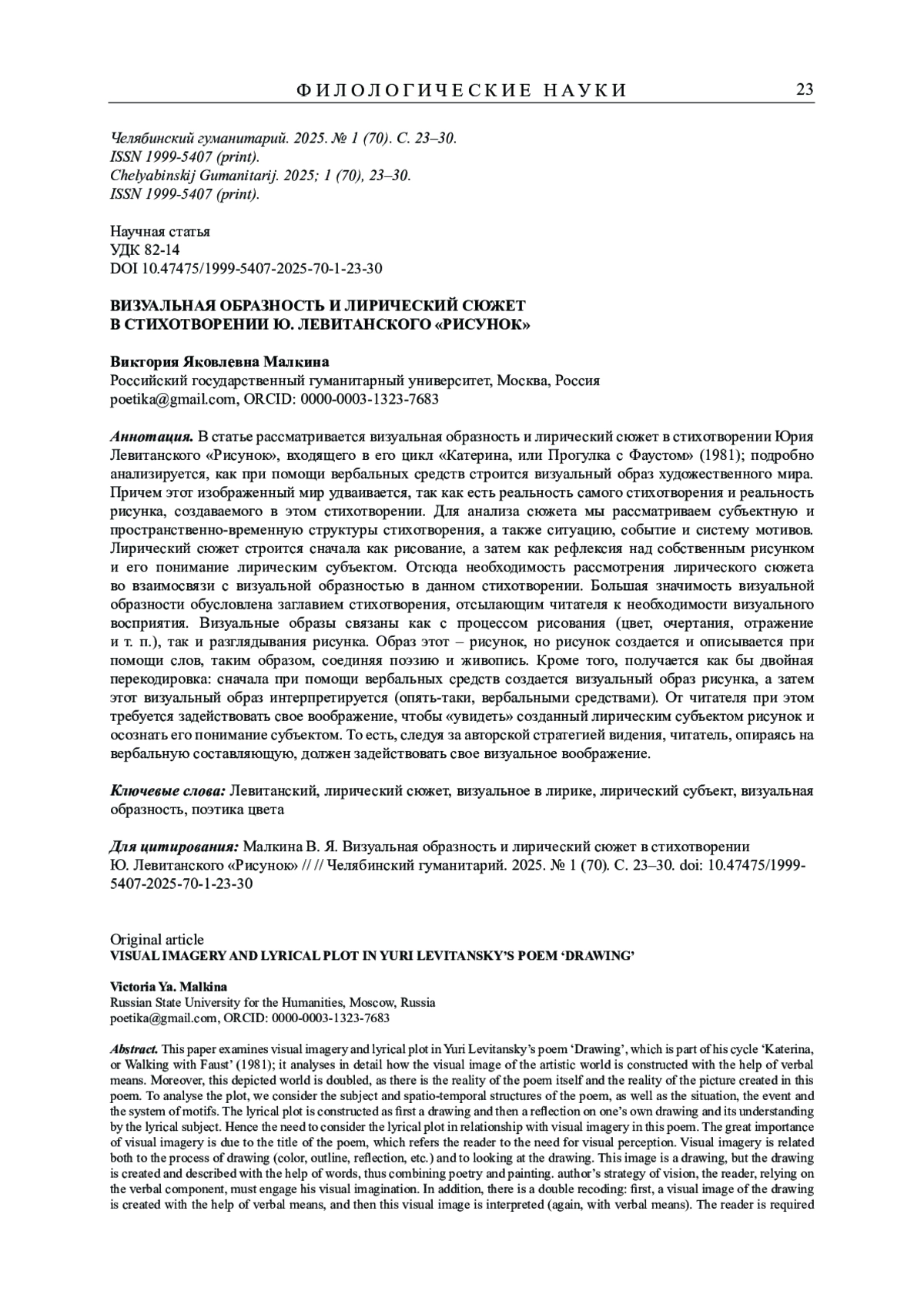 В статье рассматривается визуальная образность и лирический сюжет в стихотворении Юрия Левитанского «Рисунок», входящего в его цикл «Катерина, или Прогулка с Фаустом» (1981); подробно анализируется, как при помощи вербальных средств строится визуальный образ художественного мира. Причем этот изображенный мир удваивается, так как есть реальность самого стихотворения и реальность рисунка, создаваемого в этом стихотворении. Для анализа сюжета мы рассматриваем субъектную и пространственно-временную структуры стихотворения, а также ситуацию, событие и систему мотивов. Лирический сюжет строится сначала как рисование, а затем как рефлексия над собственным рисунком и его понимание лирическим субъектом. Отсюда необходимость рассмотрения лирического сюжета во взаимосвязи с визуальной образностью в данном стихотворении. Большая значимость визуальной образности обусловлена заглавием стихотворения, отсылающим читателя к необходимости визуального восприятия. Визуальные образы связаны как с процессом рисования (цвет, очертания, отражение и т. п.), так и разглядывания рисунка. Образ этот - рисунок, но рисунок создается и описывается при помощи слов, таким образом, соединяя поэзию и живопись. Кроме того, получается как бы двойная перекодировка: сначала при помощи вербальных средств создается визуальный образ рисунка, а затем этот визуальный образ интерпретируется (опять-таки, вербальными средствами). От читателя при этом требуется задействовать свое воображение, чтобы «увидеть» созданный лирическим субъектом рисунок и осознать его понимание субъектом. То есть, следуя за авторской стратегией видения, читатель, опираясь на вербальную составляющую, должен задействовать свое визуальное воображ