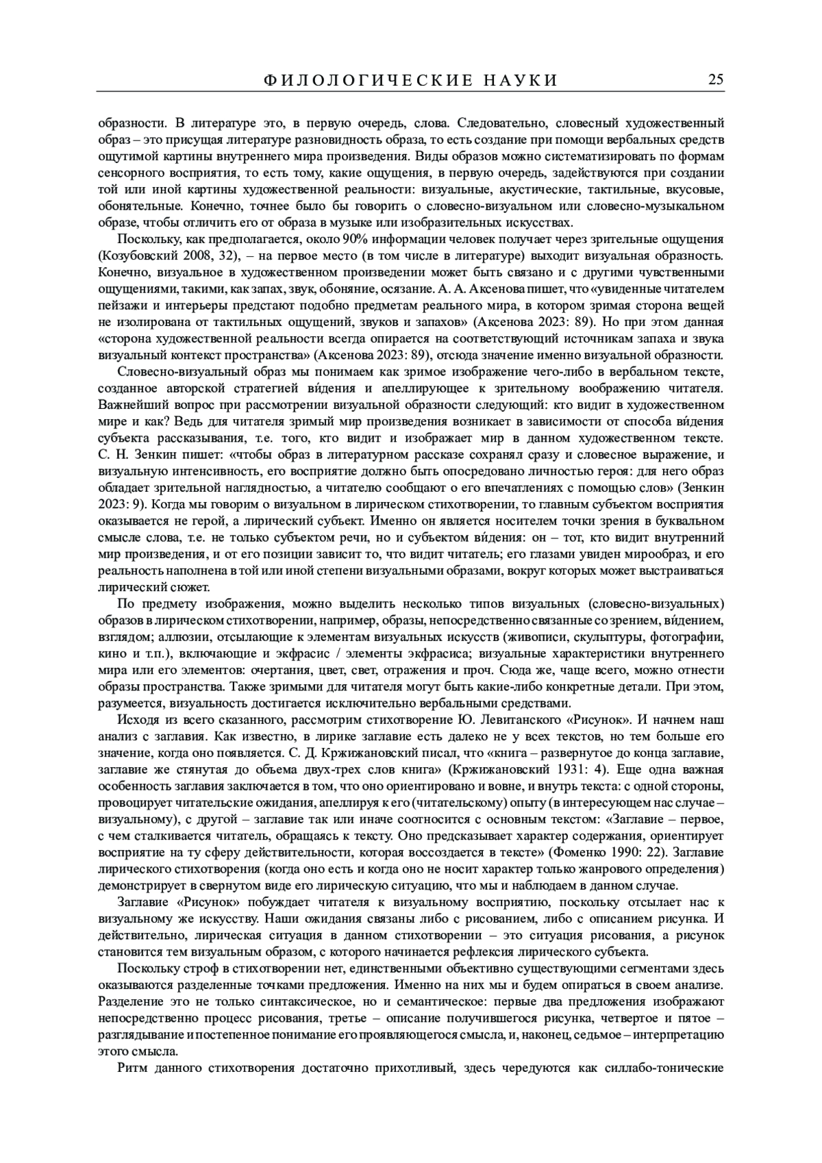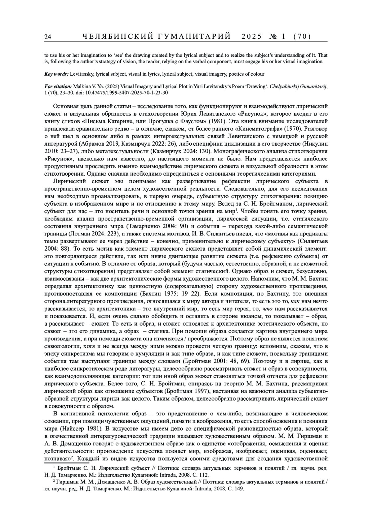 Основная цель данной статьи исследование того, как функционируют и взаимодействуют лирический сюжет и визуальная образность в стихотворении Юрия Левитанского «Рисунок», которое входит в его книгу стихов «Письма Катерине, или Прогулка с Фаустом» (1981). Эта книга внимание исследователей привлекала сравнительно редко в отличие, скажем, от более раннего «Кинематографа» (1970). Разговор о ней шел в основном либо в рамках интертекстуальных связей Левитанского с немецкой и русской литературой (Абрамов 2019, Казмирчук 2022: 26), либо специфики циклизации в его творчестве (Никулин 2010: 23-27), либо метатекстуальности (Казмирчук 2024: 130). Монографического анализа стихотворения «Рисунок», насколько нам известно, до настоящего момента не было. Нам представляется наиболее продуктивным проследить именно взаимодействие лирического сюжета и визуальной образности в этом стихотворении. Однако сначала необходимо определиться с основными теоретическими категориями.
