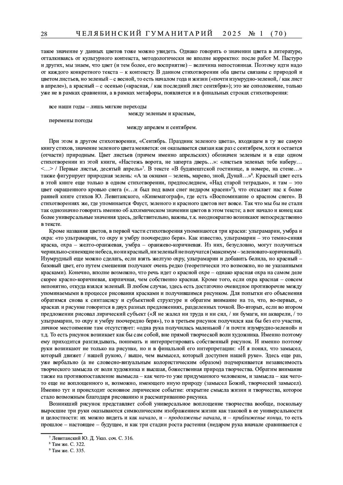 9. Казмирчук О. Ю. Метапоэтическая проблематика как основахудожественногоуниверсумастихотворения Ю. Д. Левитанского “Я был приглашен в один дом..”. // Русская классическая и неклассическая литература: текст, контекст, рецепция: сборник статей. Ярославль. 2024. С. 129-135. EDN: EURAAW