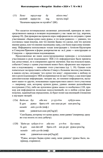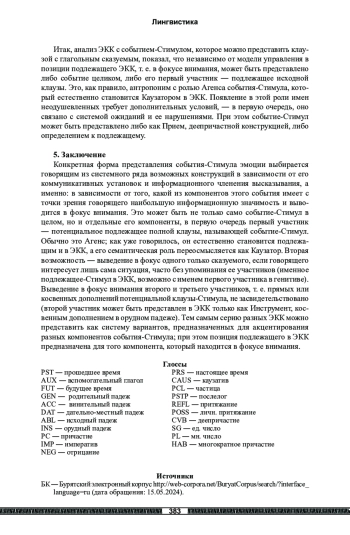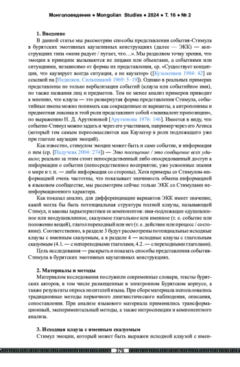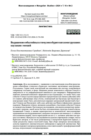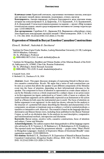 Цель исследования ― выявление и систематизация способов представления событийных стимулов в бурятских эмотивных каузативных конструкциях. Результаты. Серию таких конструкций мы описываем как систему, позволяющую говорящему поставить в фокус внимания разные компоненты события-Стимула в зависимости от их информационной значимости для говорящего. Информационно наиболее значимый компонент оформляется как подлежащее; это может быть само событие-Стимул в целом (представленное придаточным или именем действия) либо его главное действующее лицо (Агенс, понимаемый как Каузатор); при Каузаторе в конструкции может быть дополнительно выражен центральный предметный участник Стимула как Инструмент либо само действие как Прием (оформление орудным падежом). Выведение в фокус внимания дальнейших участников события-Стимула не засвидетельствовано. Как показало исследование, для анализа конкретных примеров имеет значение, какой могла бы быть потенциальная структура полной клаузы, называющей Стимул, и каковы характеристики ее компонентов: имя-подлежащее одушевленное или неодушевленное, сказуемое глагольное или именное (т. е. событие или положение вещей), глагол переходный или нет (т. е. активное действие или процесс/состояние). Материалом исследования послужили современные словари, тексты бурятских авторов, в том числе размещенные в электронном Бурятском корпусе, а также результаты опроса носителей языка. При сборе материала использовались методы первичного лингвистического наблюдения и корпусной лингвистики. При анализе языкового материала применялись сопоставительный и трансформационный методы, интроспекция и интервьюирование.