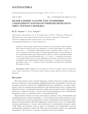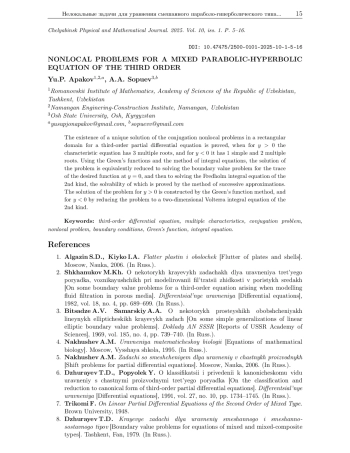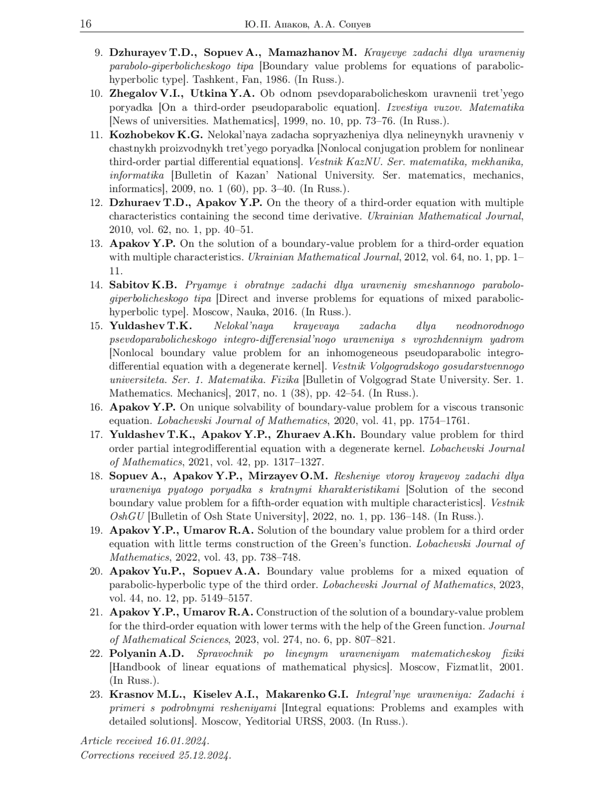 20. Apakov Yu. P., Sopuev А. A. Boundary value problems for a mixed equation of parabolic-hyperbolic type of the third order // Lobachevski Journal of Mathematics. 2023. Vol. 44, no. 12. P. 5149-5157.