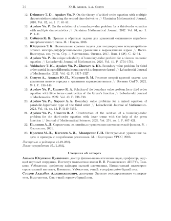 12. Dzhuraev T. D., Apakov Yu. P. On the theory of a third-order equation with multiple characteristics containing the second time derivative // Ukrainian Mathematical Journal. 2010. Vol. 62, no. 1. P. 40-51.