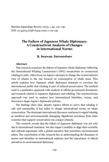 29. Imawan R., Surwandono Japanese Whale Diplomacy Kagawa-Fox, M. (2009). Japan’s Whaling Triangle - The Power Behind the Whaling Policy. Japanese Studies, 29 (3), 401-414. http://www.tandfonline.com/doi/abs/. DOI: 10.1080/10371390903298078