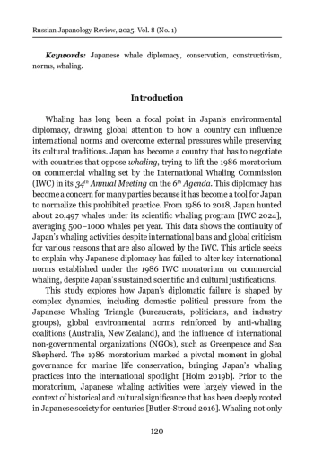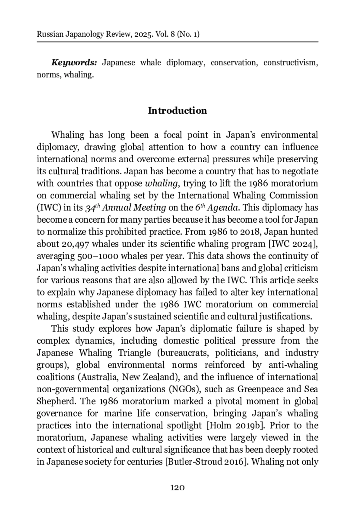 Whaling has long been a focal point in Japan’s environmental diplomacy, drawing global attention to how a country can influence international norms and overcome external pressures while preserving its cultural traditions. Japan has become a country that has to negotiate with countries that oppose whaling, trying to lift the 1986 moratorium on commercial whaling set by the International Whaling Commission (IWC) in its 34th Annual Meeting on the 6th Agenda. This diplomacy has become a concern for many parties because it has become a tool for Japan to normalize this prohibited practice. From 1986 to 2018, Japan hunted about 20,497 whales under its scientific whaling program [IWC 2024], averaging 500–1000 whales per year. This data shows the continuity of Japan’s whaling activities despite international bans and global criticism for various reasons that are also allowed by the IWC. This article seeks to explain why Japanese diplomacy has failed to alter key international norms established under the 1986 IWC moratorium on commercial whaling, despite Japan’s sustained scientific and cultural justifications.