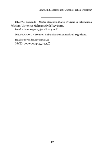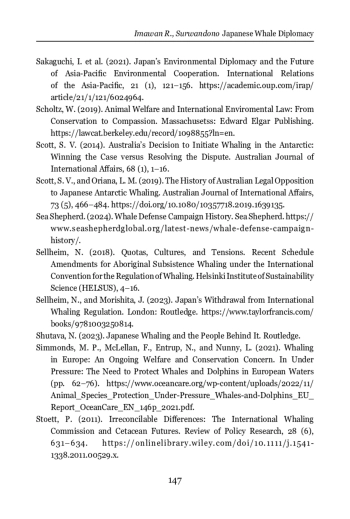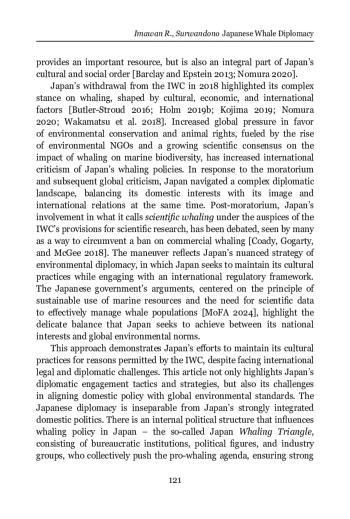 25. Imawan, R., Wirasenjaya, A. M., and Zhafran, M. Y. (2021). Japan’s Rejection of International Norms against Whaling“ In M. Senge et al. (eds.), E3S Web of Conferences, 316, 04016. https://www.e3s-conferences.org/. DOI: 10.1051/e3sconf/202131604016