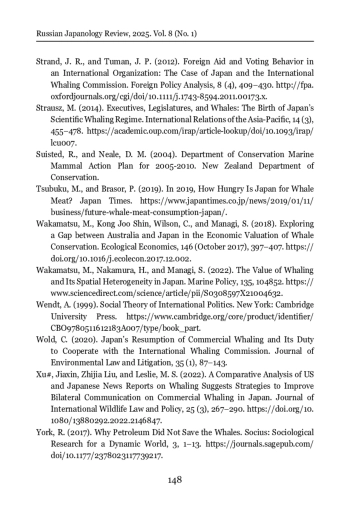 19. Harrell, A. M. (2020). Whaling in Japan: Conflicts and Controversies Surrounding a Dying Tradition. The Macksey Journal, 1, 185. https://mackseyjournal.scholasticahq.com/article/21871-whaling-in-japanconflicts-and-controversies-surrounding-a-dying-tradition.