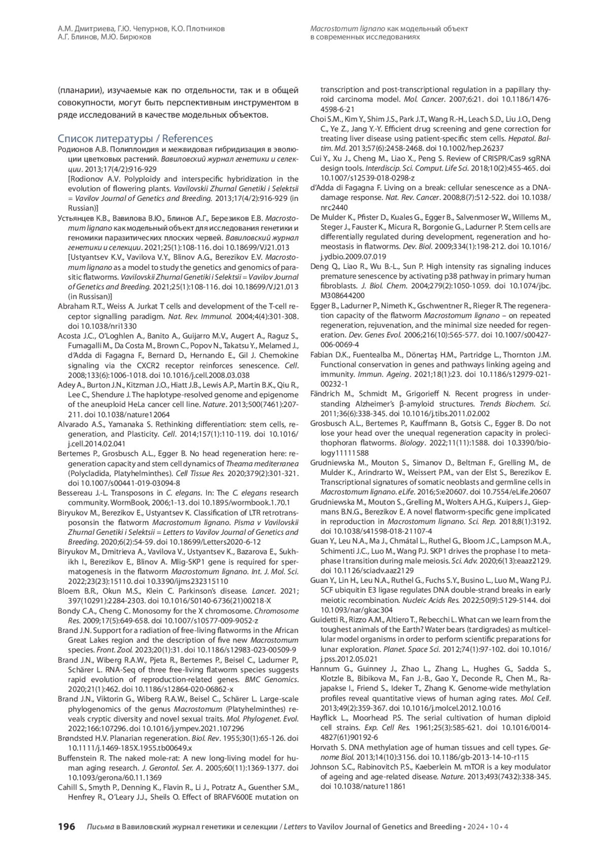 2. Устьянцев К.В., Вавилова В.Ю., Блинов А.Г., Березиков Е.В. Macrostomum lignano как модельный объект для исследования генетики и геномики паразитических плоских червей. Вавиловский журнал генетики и селекции. 2021;25(1):108-116. DOI: 10.18699/VJ21.013 EDN: JFQURM