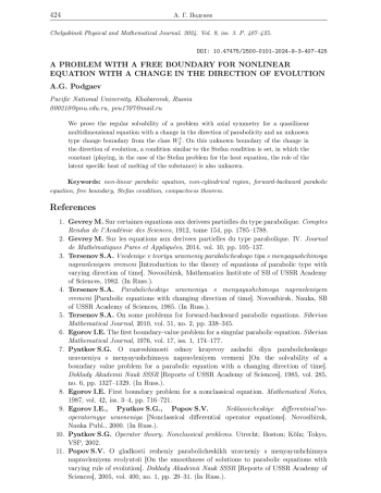20. Подгаев А. Г. Разрешимость осесимметричной задачи для нелинейного параболического уравнения в областях с нецилиндрической или неизвестной границей. I // Челяб. физ.-мат. журн. 2020. Т. 5, вып. 1. С. 44-55. EDN: UKIGJQ