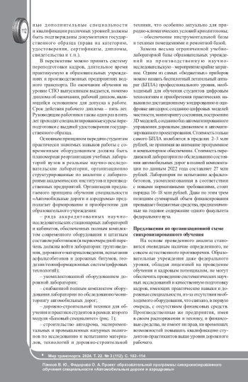 В рамках задачи открытия в области транспортного образования отдельной укрупненной группы специальностей и направлений, авторы, основываясь на многолетнем педагогическом и производственном опыте, разработали для включения в нее эксклюзивный проект программы синхронизированного обучения специальности «Автомобильные дороги и аэродромы». В статье, в том числе с целью обсуждения профессиональным сообществом, представлена модульная схема синхронизированной основной профессиональной образовательной программы «Автомобильные дороги и аэродромы», рассмотрена специфика структурирования каждого модуля и наполнения его дисциплинами. Особое внимание уделено хорошо известной проблеме соотношения в образовательном процессе количества гуманитарных и технических дисциплин. Показаны основные причины появления в общих профессиональных образовательных программах технической направленности повышенного количества гуманитарных дисциплин. Сделаны предложения по механизмам ликвидации существующих диспропорций. Детально обсуждаются основные проблемы в системе организации обучения техническим специальностям в части финансирования программ, обеспечения программ разрабатываемой укрупненной группы специальностей «Дорожное хозяйство» требованиями профессиональных стандартов, образовательного процесса и научно-исследовательских работ выпускающих кафедр - исследовательским/лабораторным оборудованием и дорожными машинами. Предложен один из возможных путей внедрения программы «Автомобильные дороги и аэродромы» в практику профессионального обучения системы образовательных организаций высшего образования Российской Федерации. Авторы обосновывают мнение, что наиболее перспективным решением будет создание Межведомственных научно-образовательных центров регионального значения (МНОЦ), привязанных к конкретным дорожно-климатическим зонам. Полный текст статьи в переводе на английский язык публикуется во второй части данного выпуска.