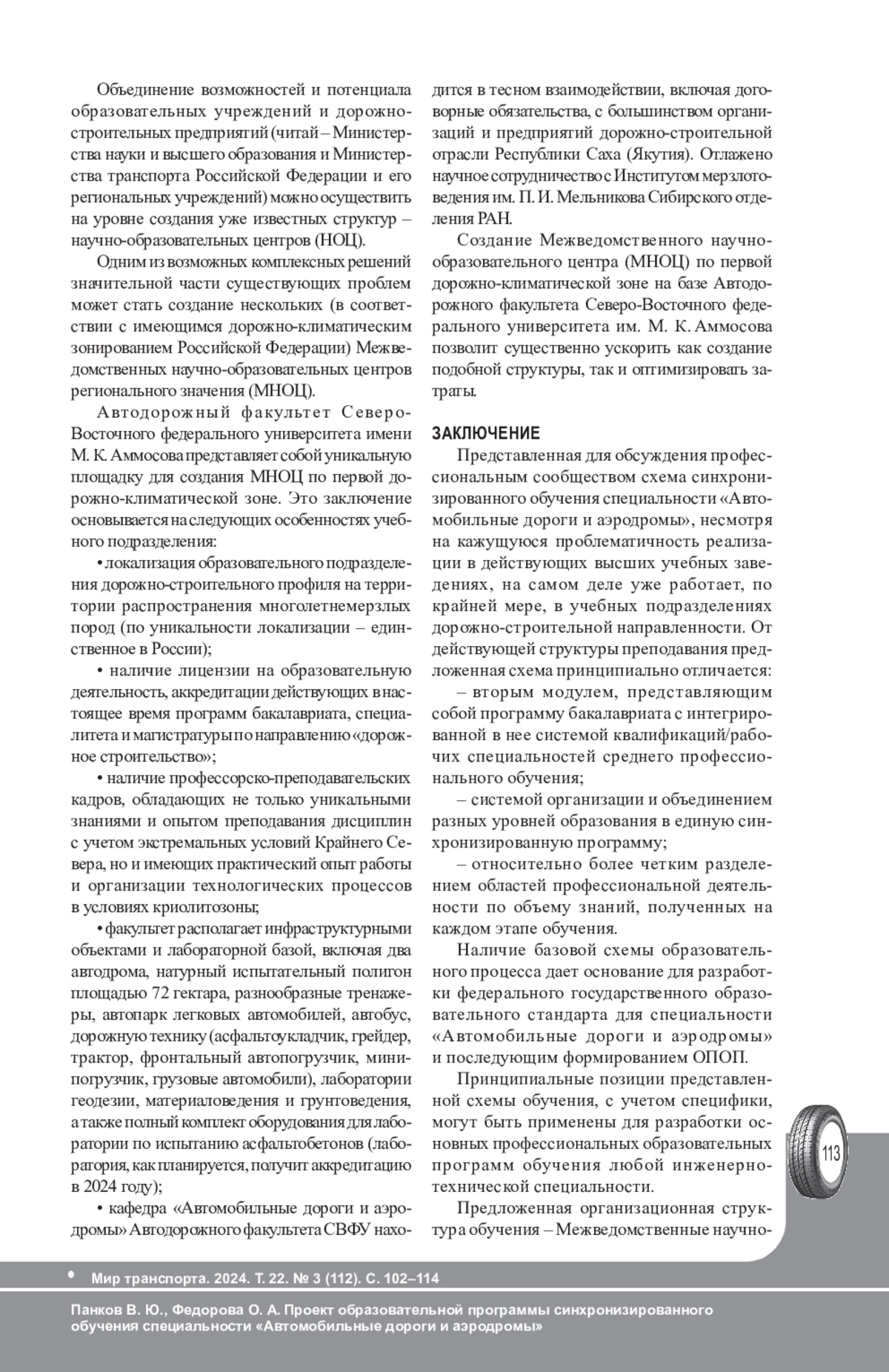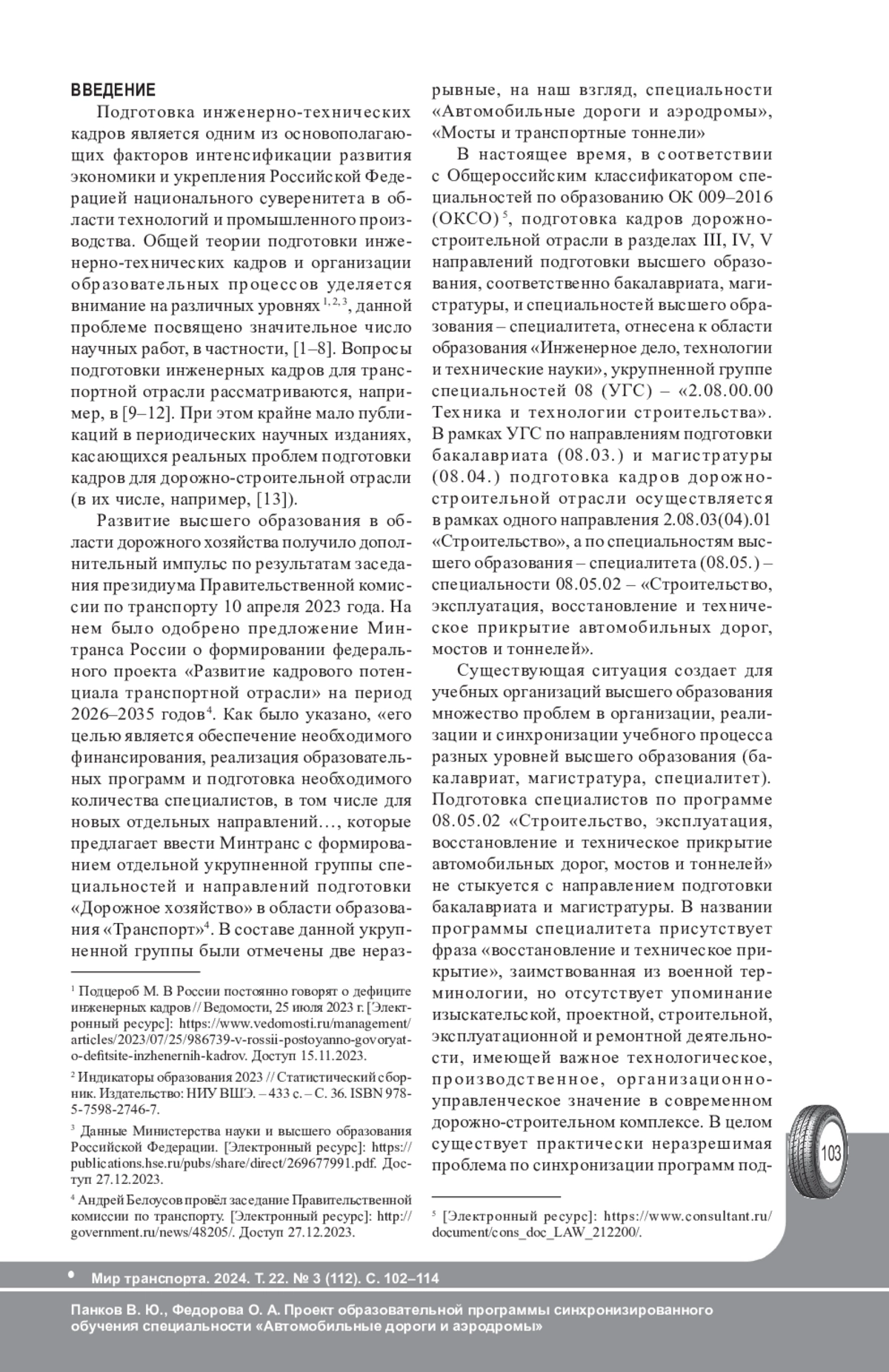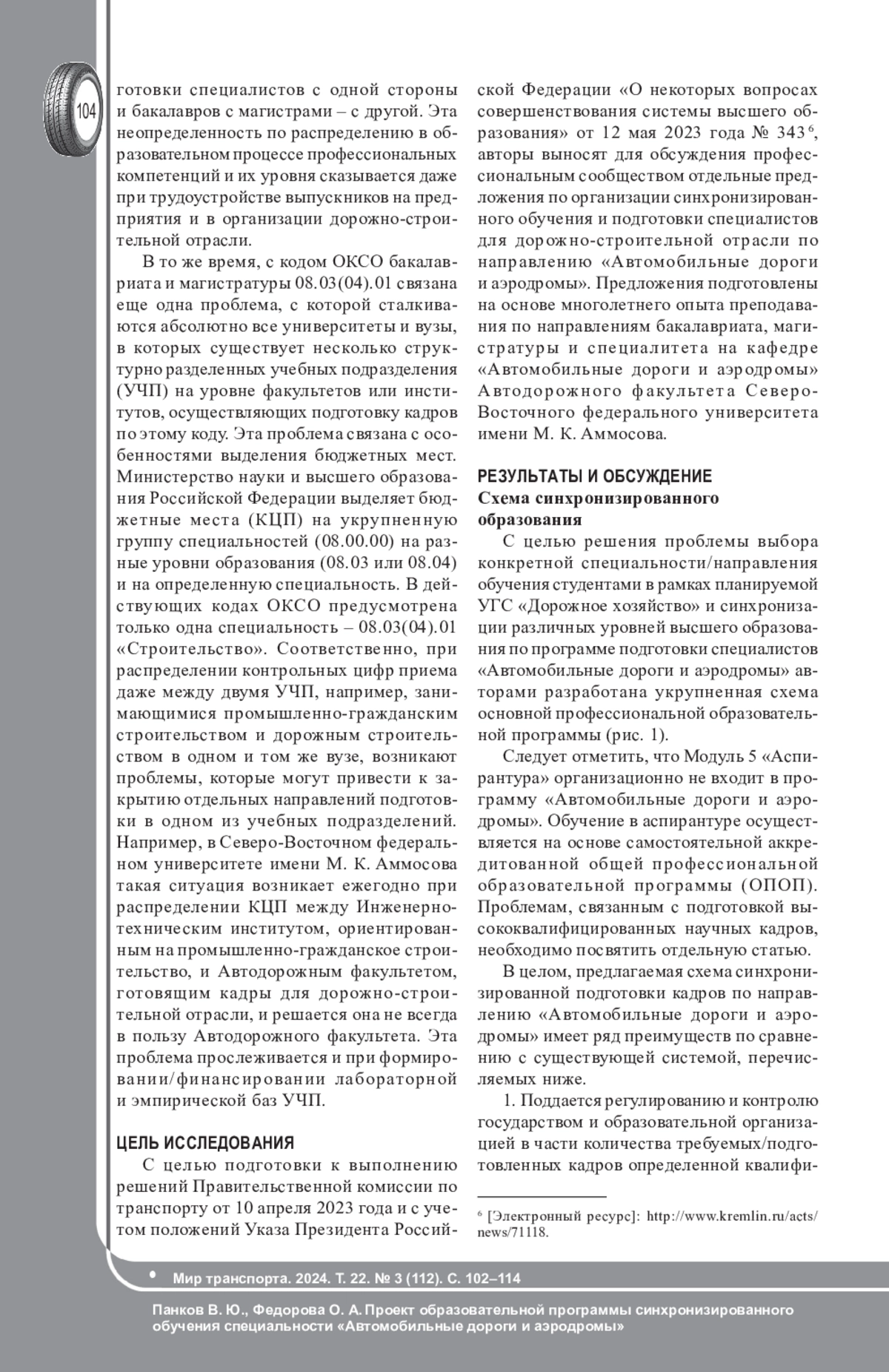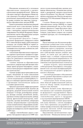 ПАНКОВ В. Ю., ФЕДОРОВА О. А. ПРОЕКТ ОБРАЗОВАТЕЛЬНОЙ ПРОГРАММЫ СИНХРОНИЗИРОВАННОГО ОБУЧЕНИЯ СПЕЦИАЛЬНОСТИ «АВТОМОБИЛЬНЫЕ ДОРОГИ И АЭРОДРОМЫ» // МИР ТРАНСПОРТА. 2024. Т. 22 № 3 (112)