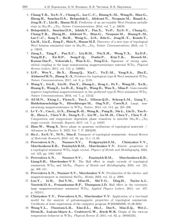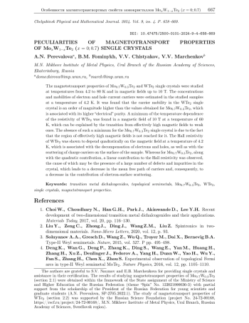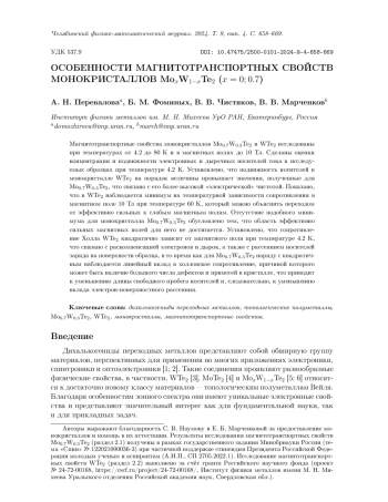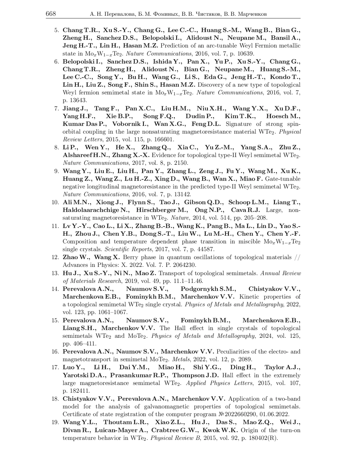 16. Perevalova A. N., Naumov S. V., Marchenkov V. V. Peculiarities of the electroand magnetotransport in semimetal MoTe2 // Metals. 2022. Vol. 12. P. 2089. EDN: DNZSGK