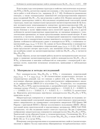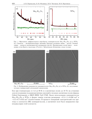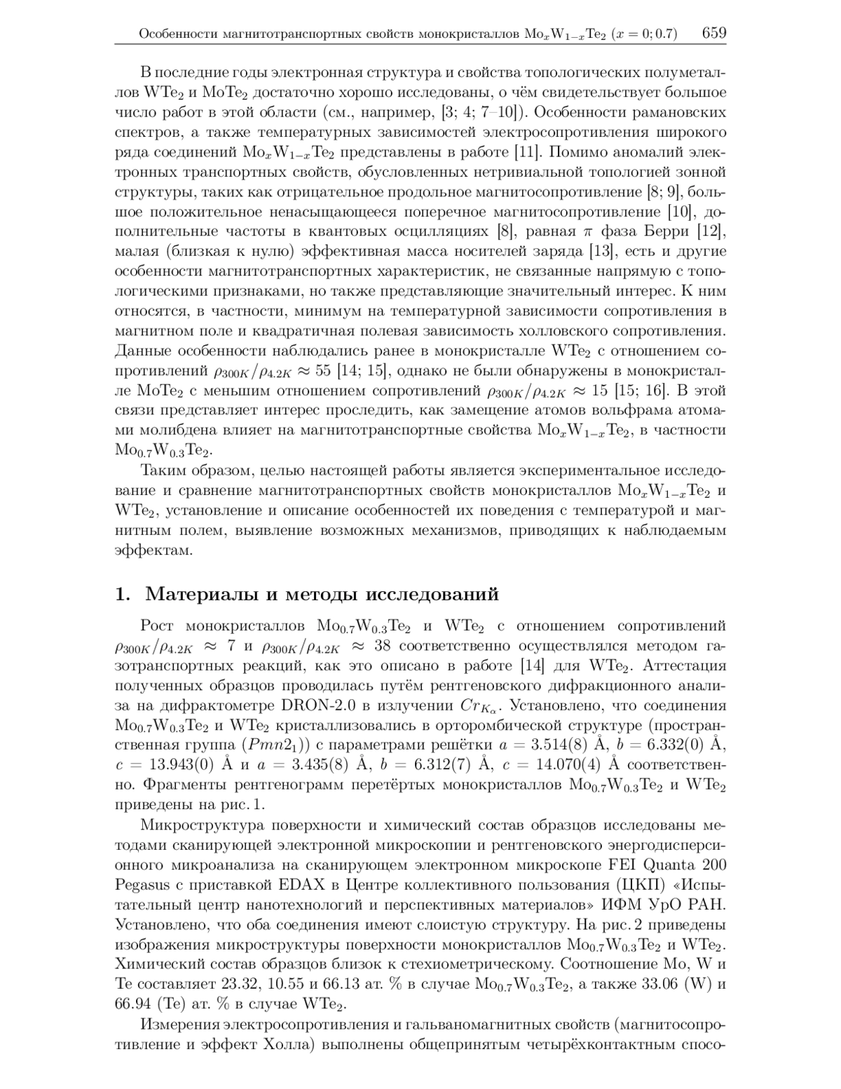 Дихалькогениды переходных металлов представляют собой обширную группу материалов, перспективных для применения во многих приложениях электроники, спинтроники и оптоэлектроники [1; 2]. Такие соединения проявляют разнообразные физические свойства, в частности, WTe2 [3], MoTe2 [4] и MoxW1−xTe2 [5; 6] относятся к достаточно новому классу материалов — топологическим полуметаллам Вейля. Благодаря особенностям зонного спектра они имеют уникальные электронные свойства и представляют значительный интерес как для фундаментальной науки, так и для прикладных задач