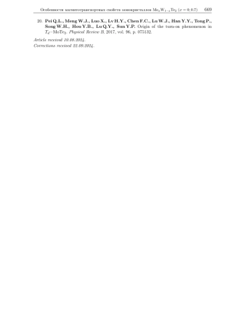 20. Pei Q. L., Meng W. J., Luo X., Lv H. Y., Chen F. C., Lu W. J., Han Y. Y., Tong P., Song W. H., Hou Y. B., Lu Q. Y., Sun Y. P. Origin of the turn-on phenomenon in Td-MoTe2 // Physical Review B. 2017. Vol. 96. P. 075132.