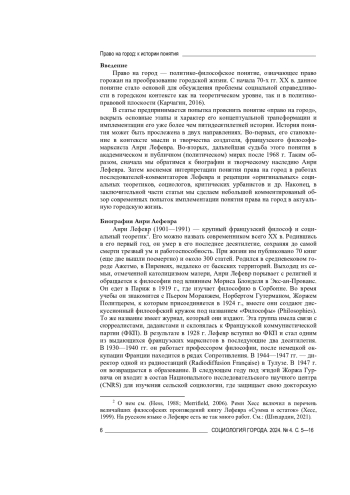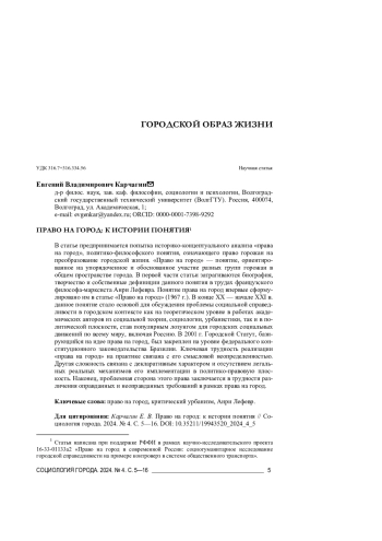 В статье предпринимается попытка историко-концептуального анализа «права на город», политико-философского понятия, означающего право горожан на преобразование городской жизни. «Право на город» - понятие, ориентированное на упорядоченное и обоснованное участие разных групп горожан в общем пространстве города. В первой части статьи затрагиваются биография, творчество и собственные дефиниции данного понятия в трудах французского философа-марксиста Анри Лефевра. Понятие права на город впервые сформулировано им в статье «Право на город» (1967 г.). В конце XX - начале XXI в. данное понятие стало основой для обсуждения проблемы социальной справедливости в городском контексте как на теоретическом уровне в работах академических авторов из социальной теории, социологии, урбанистики, так и в политической плоскости, став популярным лозунгом для городских социальных движений по всему миру, включая Россию. В 2001 г. Городской Статут, базирующийся на идее права на город, был закреплен на уровне федерального конституционного законодательства Бразилии. Ключевая трудность реализации «права на город» на практике связана с его смысловой неопределенностью. Другая сложность связана с декларативным характером и отсутствием легальных реальных механизмов его имплементации в политико-правовую плоскость. Наконец, проблемная сторона этого права заключается в трудности различения оправданных и неоправданных требований в рамках права на город.