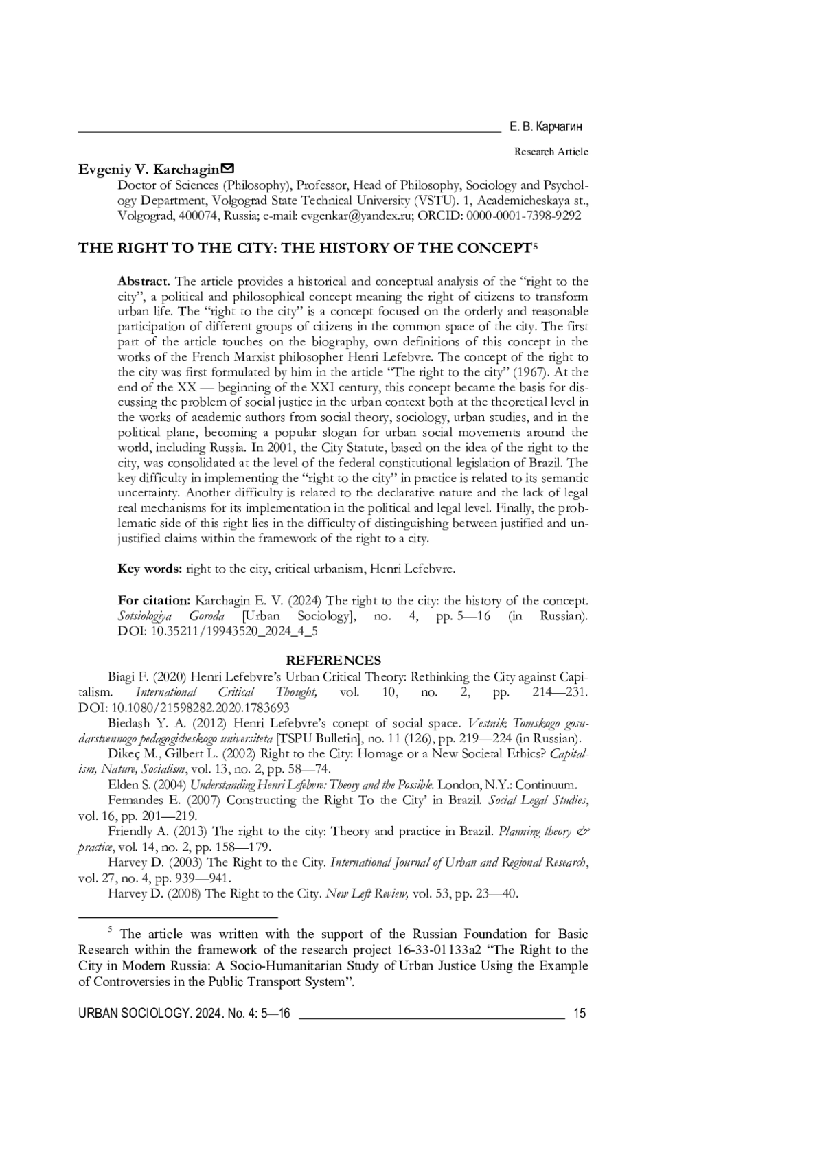 5. Карчагин Е. В. Справедливость в городе: контуры концепции городской справедливости // Социология города. 2016. № 1. С. 84-92. EDN: VPKISH