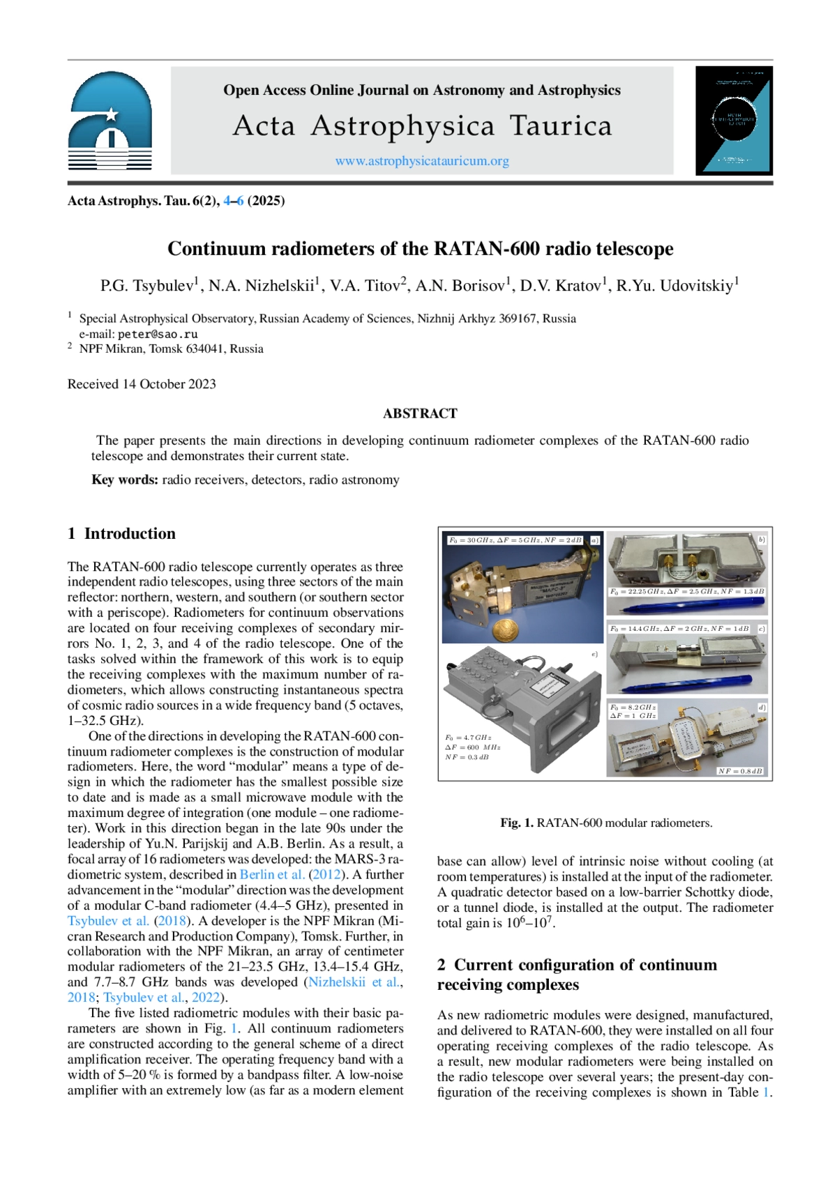 TSYBULEV P.G., NIZHELSKII N.A., TITOV V.A., BORISOV A.N., KRATOV D.V., UDOVITSKIY R.YU. CONTINUUM RADIOMETERS OF THE RATAN-600 RADIO TELESCOPE // ACTA ASTROPHYSICA TAURICA. 2025. № 2, ТОМ 6