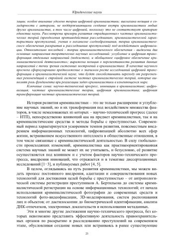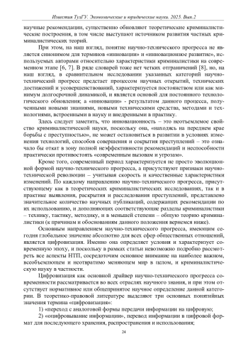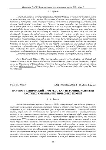 История развития криминалистики – это не только расширение и углубление научных знаний, но и их трансформация под воздействием множества факторов, в числе немаловажных из которых – научно-технический прогресс (далее – НТП), непосредственно влияющий как на предмет криминалистики, так и на криминалистические средства и методы борьбы с преступностью. Современный период характеризуется ускорением темпов развития, повсеместным внедрением информационных технологий, цифровизацией абсолютно всех сфер жизни, встраиванием искусственного интеллекта в общественные отношения, в том числе связанные с криминалистической деятельностью. В силу глобальности происходящих изменений, криминалистика как практикоориентированная система научных знаний не может их не учитывать, и безусловно, её развитие осуществляется под влиянием и с учетом факторов научно-технического прогресса, внедрения инноваций, что отражается и в тематике диссертационных исследований [1−3], и публикуемых работ [4, 5].