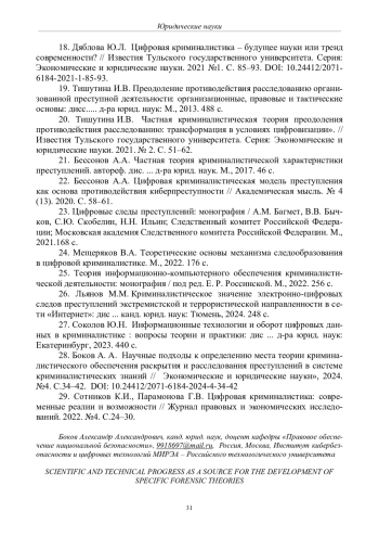22. Бессонов А.А. Цифровая криминалистическая модель преступления как основа противодействия киберпреступности // Академическая мысль. № 4 (13). 2020. С. 58-61. EDN: CHQQAU